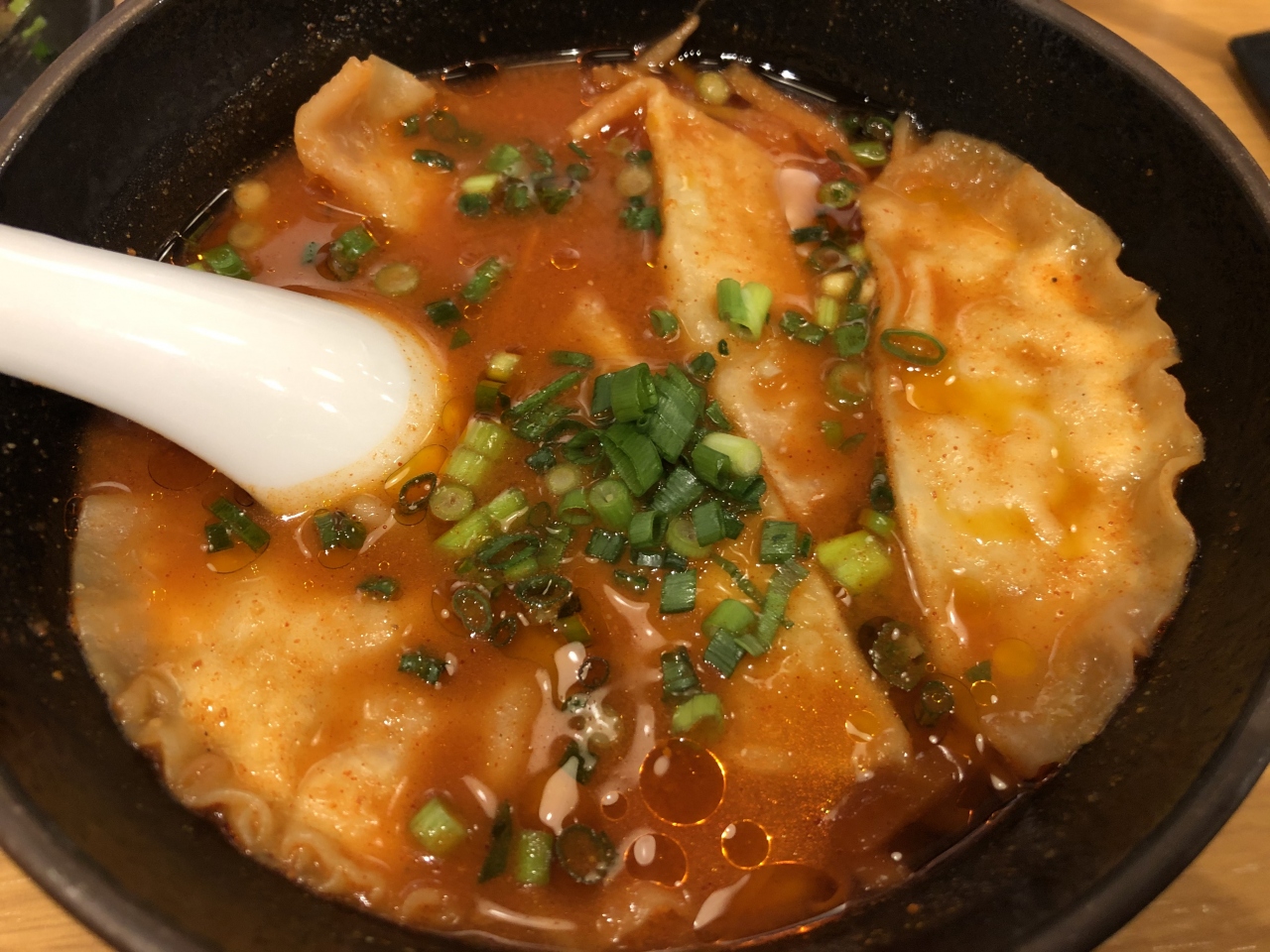 二皿目は、赤の水餃子(1人前:5個)540円。辛口味噌スープがとっても美味い。- 旅行時期