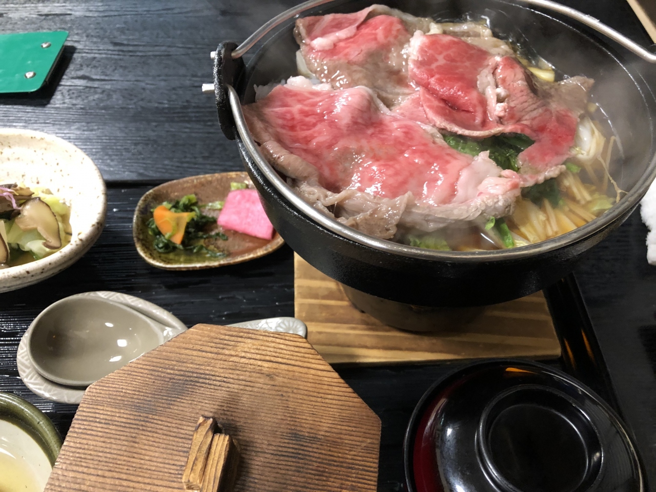 メインの牛鍋は、ちょうど火が通ったタイミングに、店員がご飯と味噌汁を運んでくるというのもうれしい。- 旅行時期