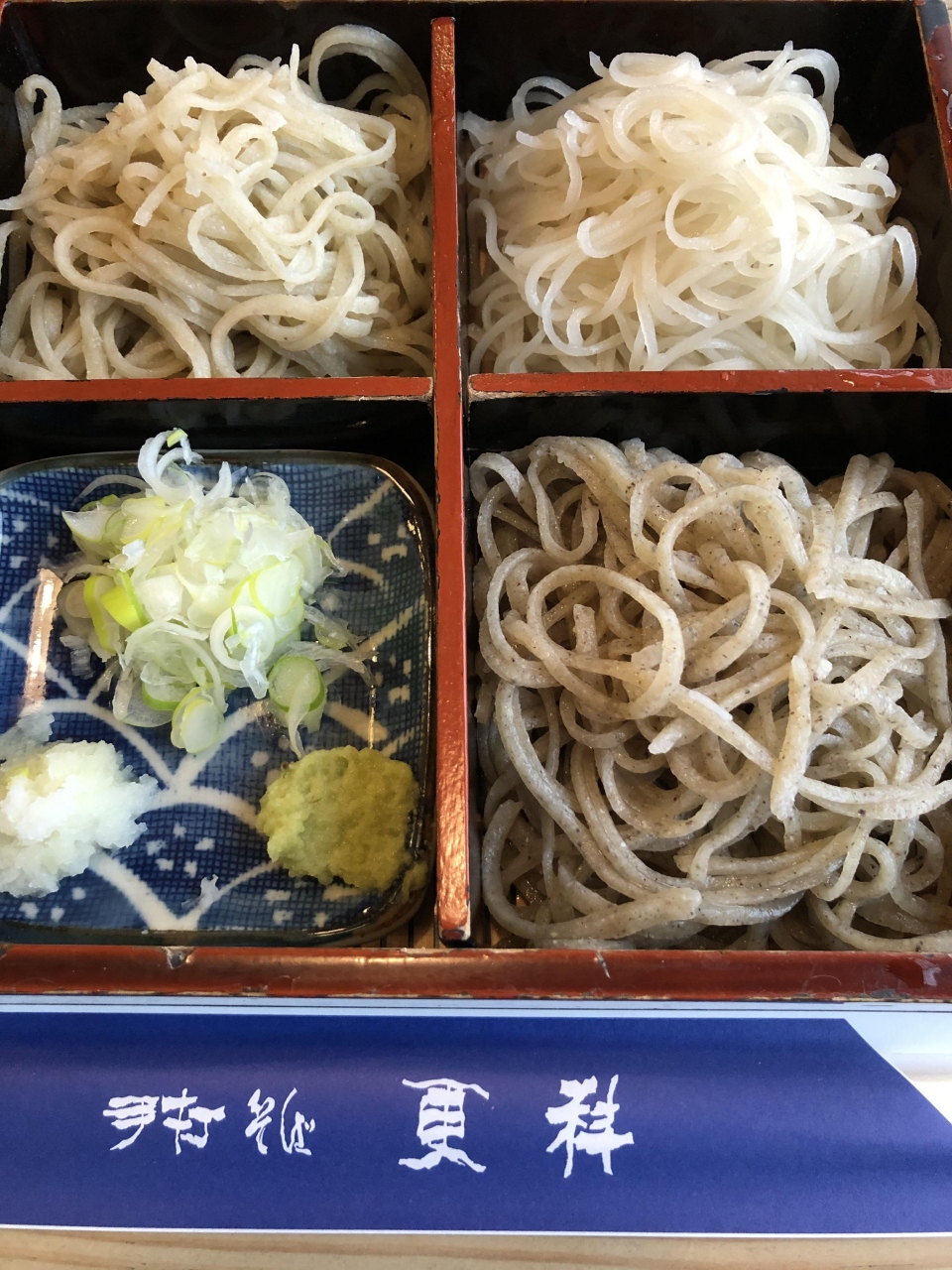 田舎そば、せいろそば、さらしなそばのセットで、それぞれが区切られたお膳に盛られてくる。