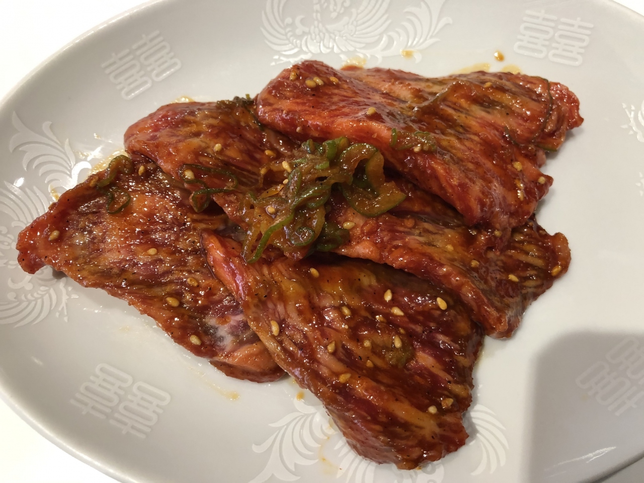 お膳で運ばれてきた、肉(ロース、カルビ、ハラミ)の大きさにびっくり。