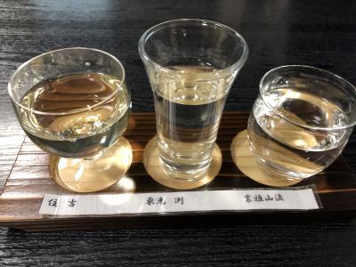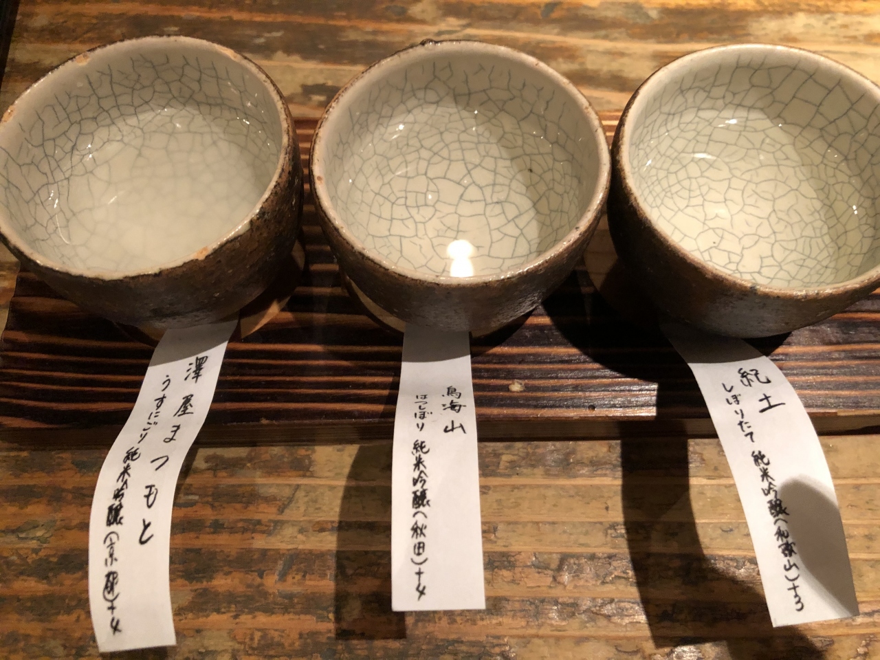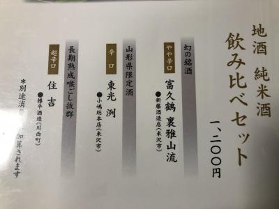 夜の人気メニュー「牛鍋定食」をチョイス。ついでに、牛鍋をまつ間に、「地酒純米酒飲み比べセット」も。