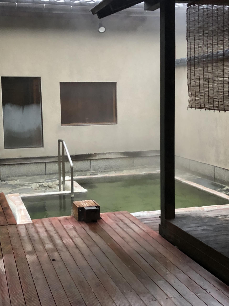 大浴場は、さほど広くはないものの、こんこんと湧き出る源泉掛け流しの湯は気持ちよく、露天風呂でのエメラルドグリーンはよく映える。