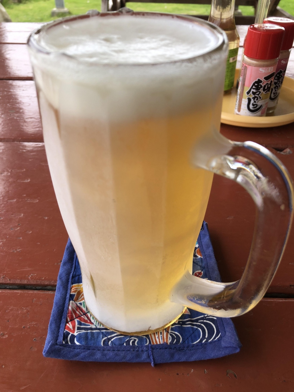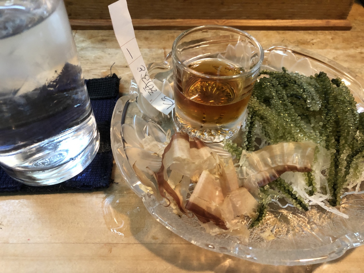 沖縄にきたら定番の「海ぶどう」をおつまみに、泡盛「久米島」を味わいます。