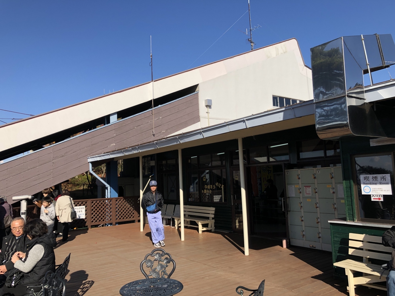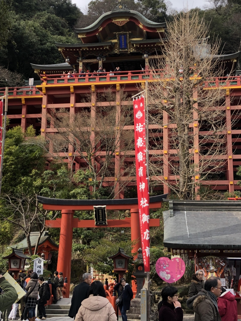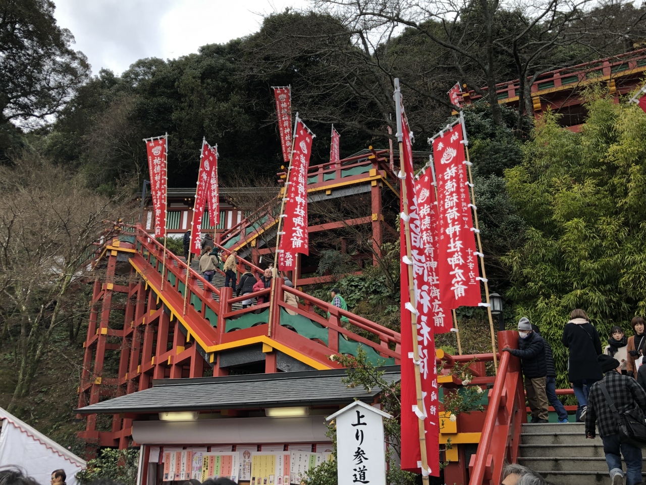 20分あまり歩いて神社の入口に辿り着くと、高台に朱色に彩られた本殿が姿を現します。御神楽殿に参拝したあと、階段を上って御本殿へ。それほどキツイ階段ではありませんが、「有料」のエレベータコースも用意されています。これ、利用者いるんですかね???