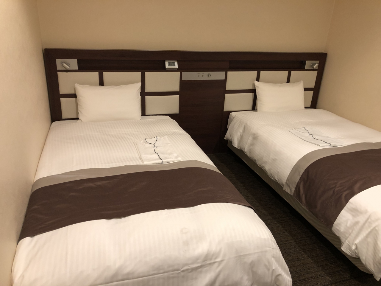 ツインルームの部屋は思ったより広くて、内装もシックで落ち着いている。全室禁煙で、1階の駐車場脇までいかないと喫煙できないのが難点だが、すぐ隣にコンビニもあり便利だった。- 旅行時期