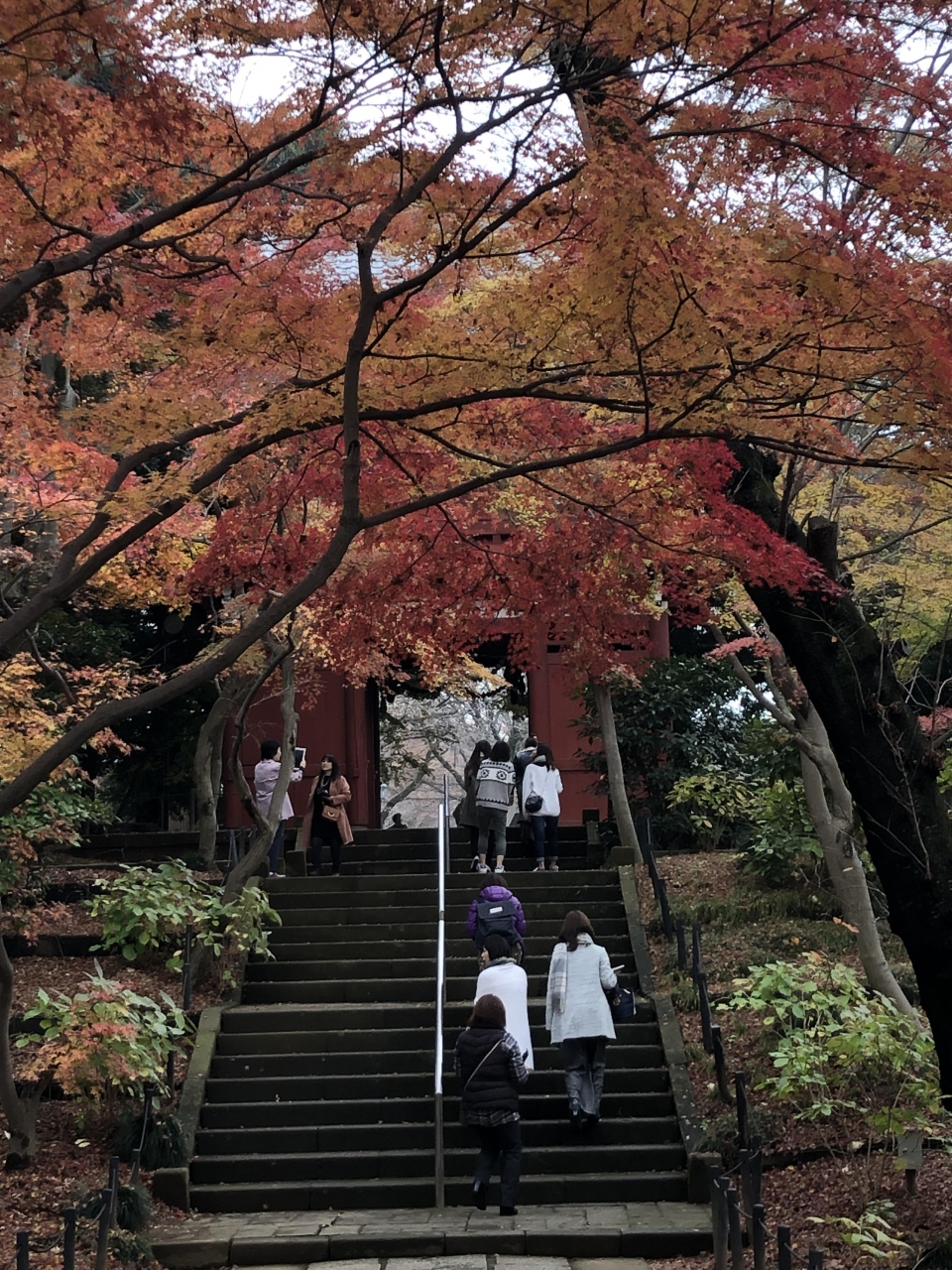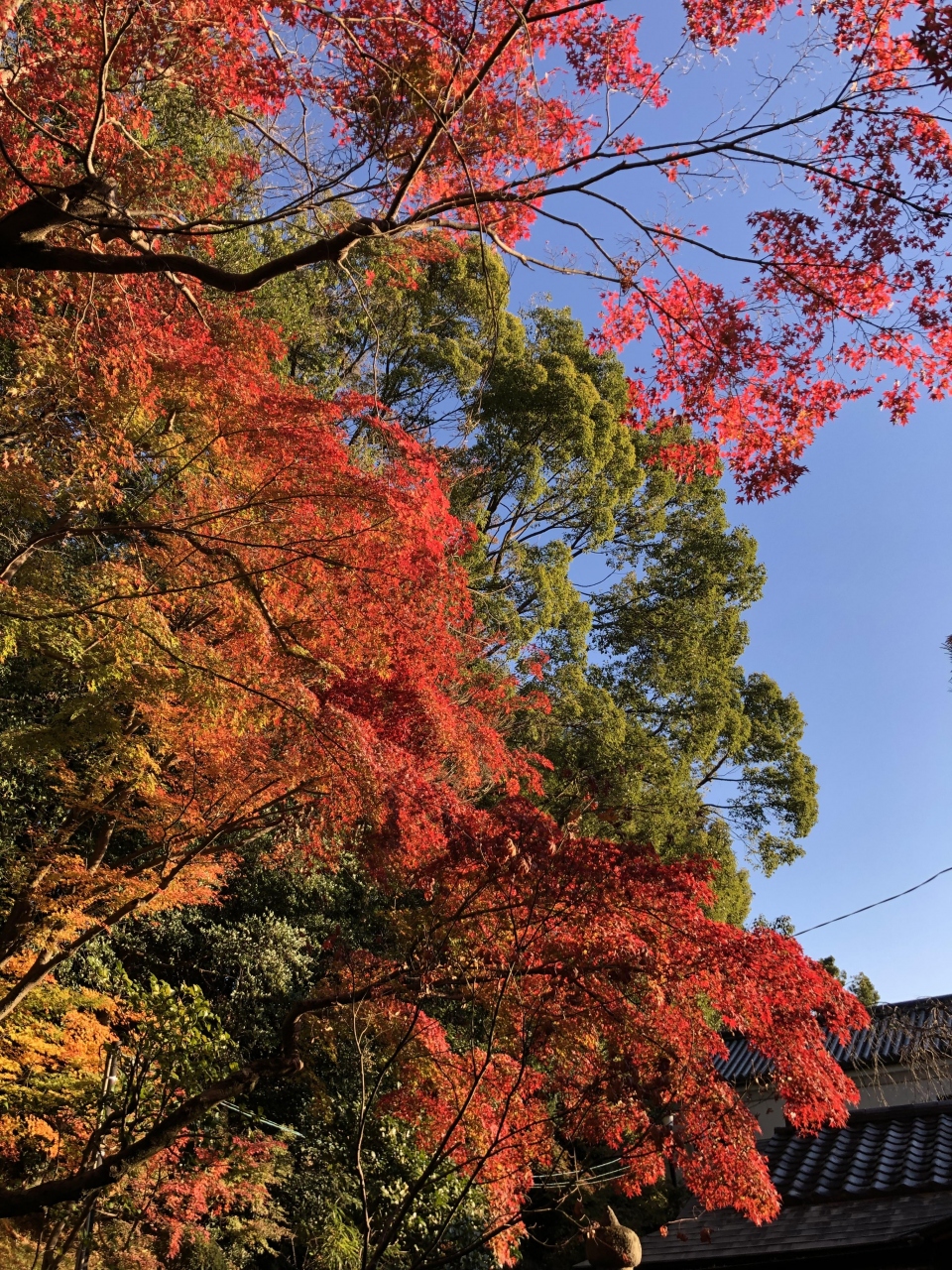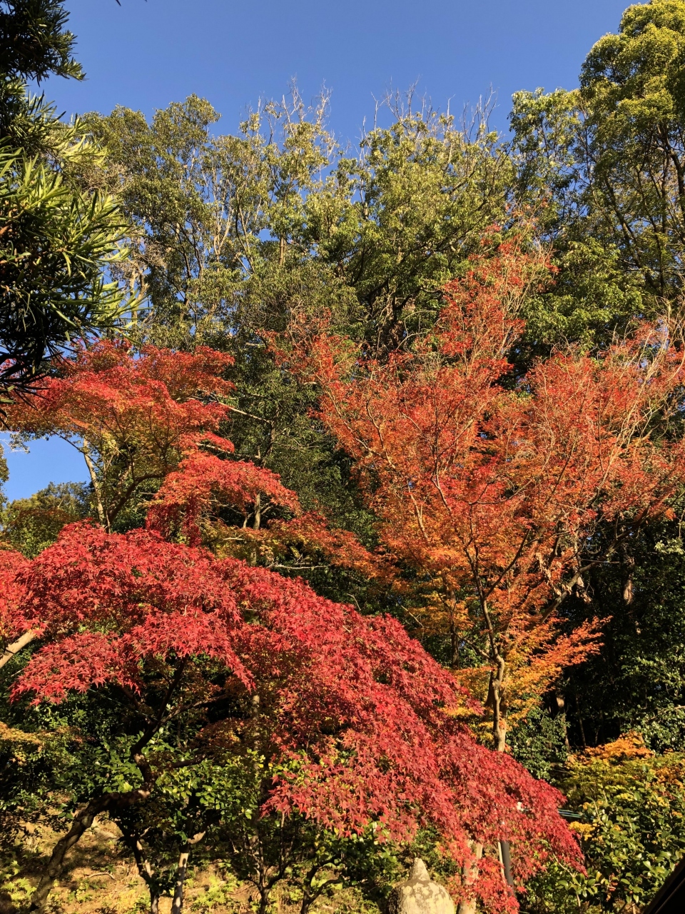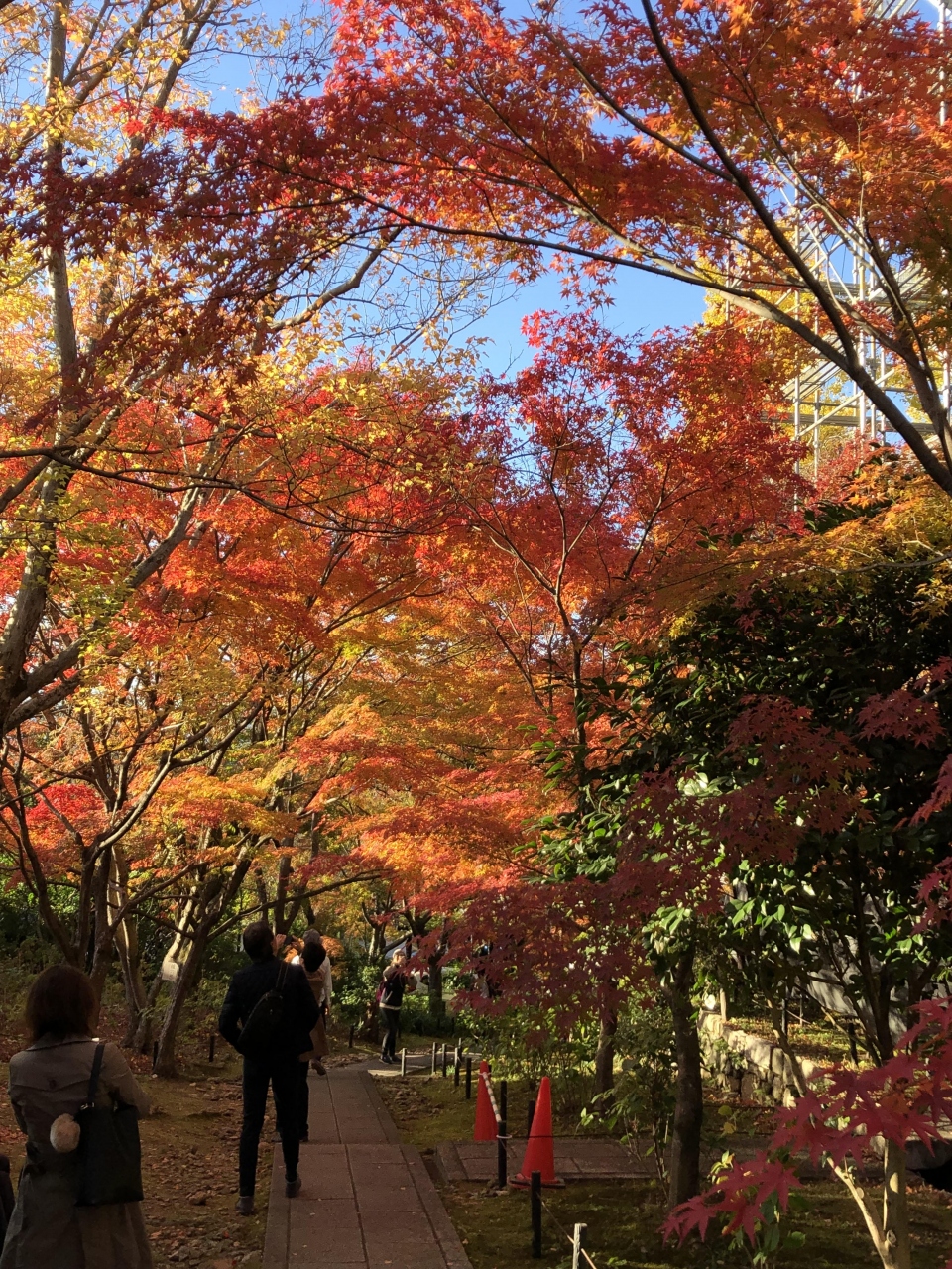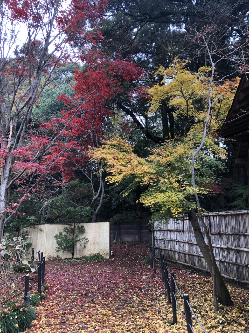 思った以上に広い境内の中を歩くと、色とりどりの紅葉で、特に落ちた黄色・赤色の葉っぱのコントラストが美しかった。