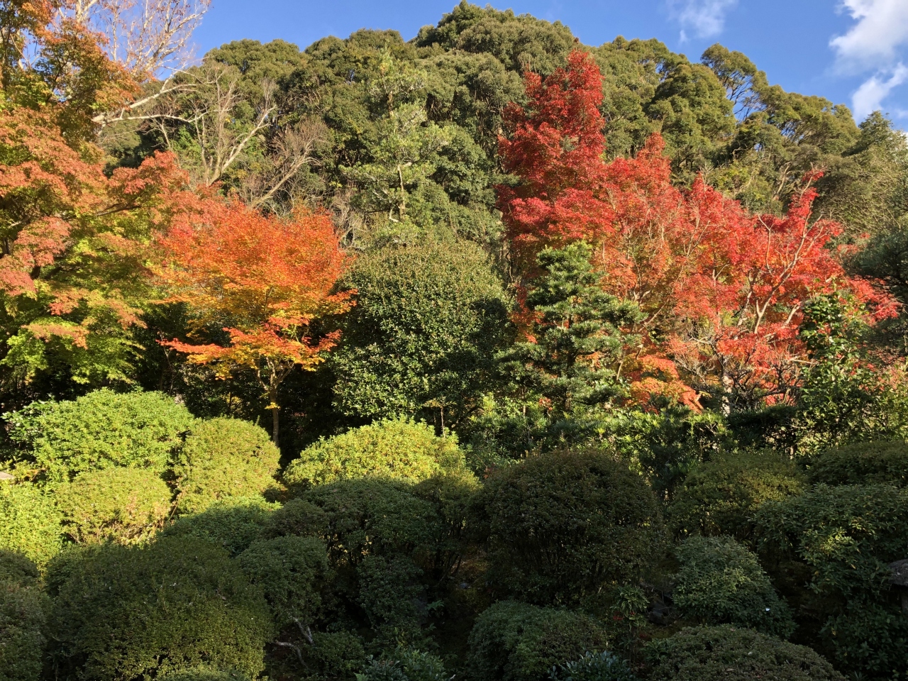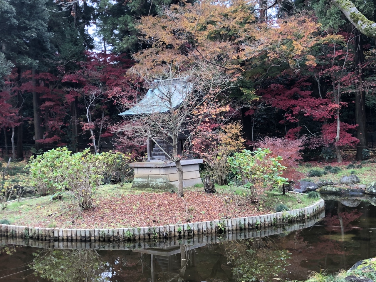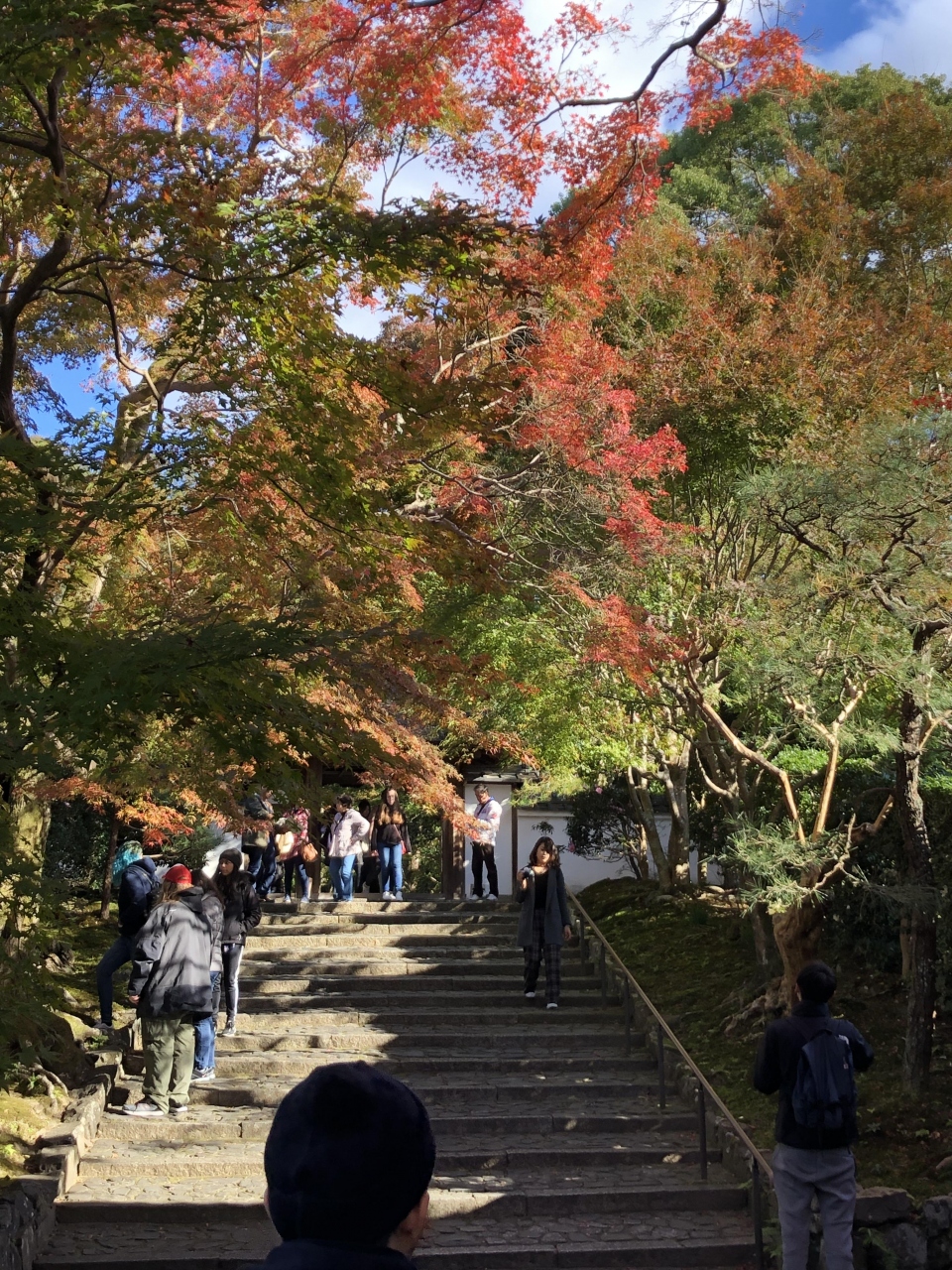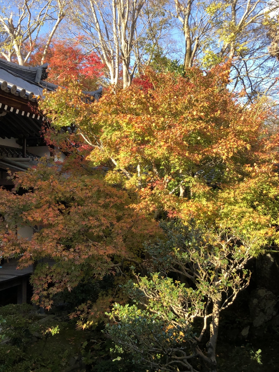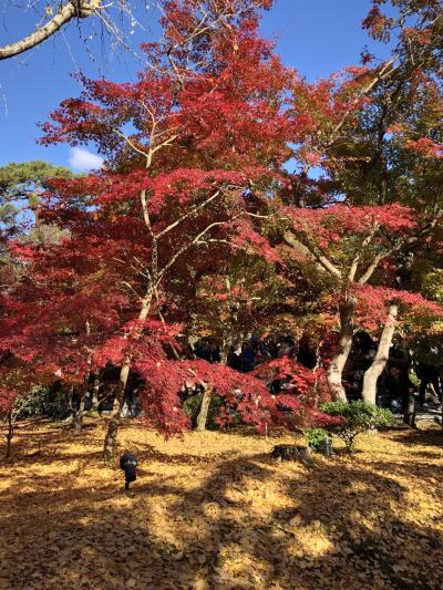 思った以上に広い境内の中を歩くと、色とりどりの紅葉で、特に落ちた黄色・赤色の葉っぱのコントラストが美しかった。