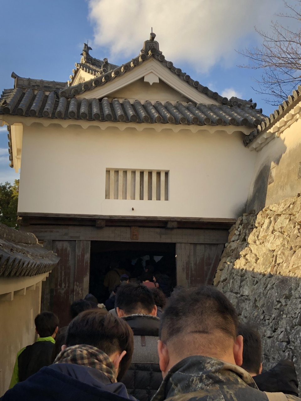 入城終了時刻4時の15分前で、ギリギリの入城。入城口から中に入ると、石垣に囲まれた道をいくつもの門を通って、天守閣近くの「にの門」に着くと、3連休の初日とあって、入城待ちのお客さんで大渋滞中。天守閣に入っても、上り階段待ちの大渋滞。