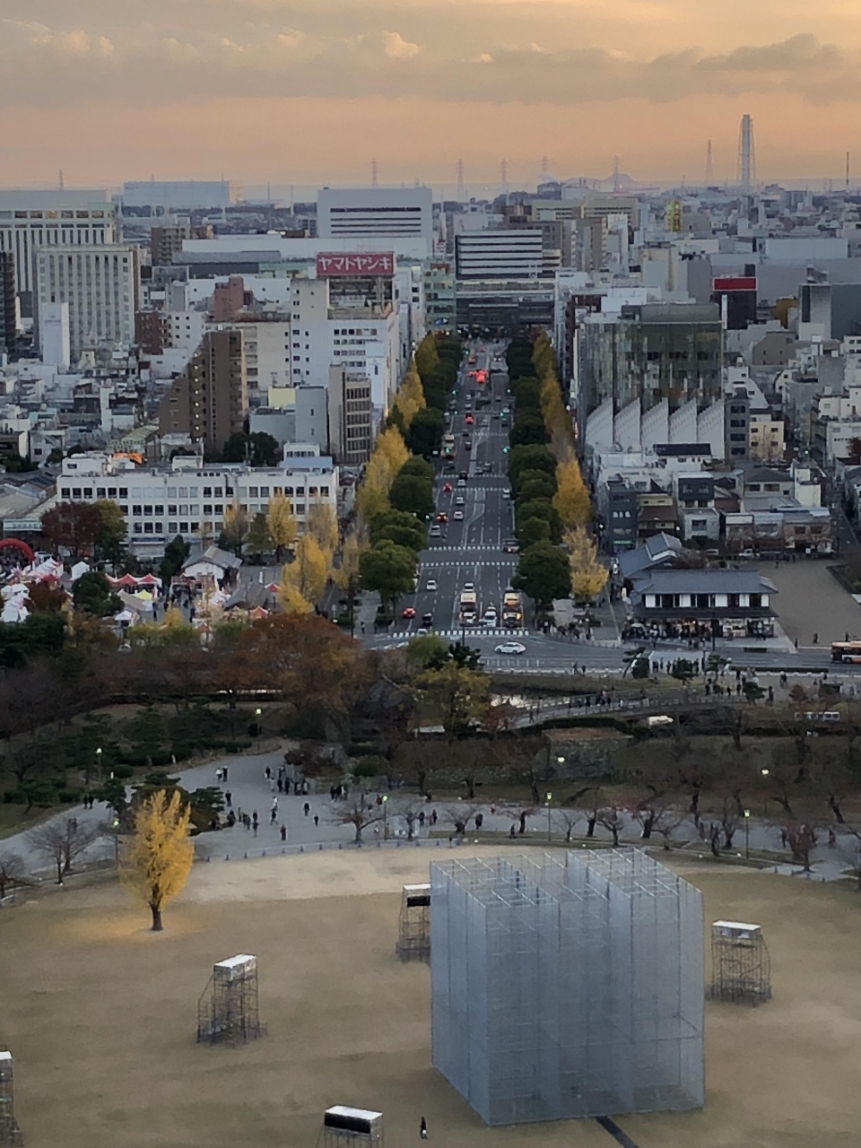 天守閣の外に出ると、閉門時刻の5時近くとなっており、ライトアップが始まっていた。- 旅行時期