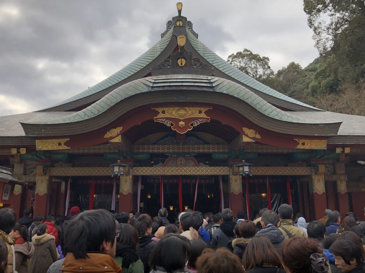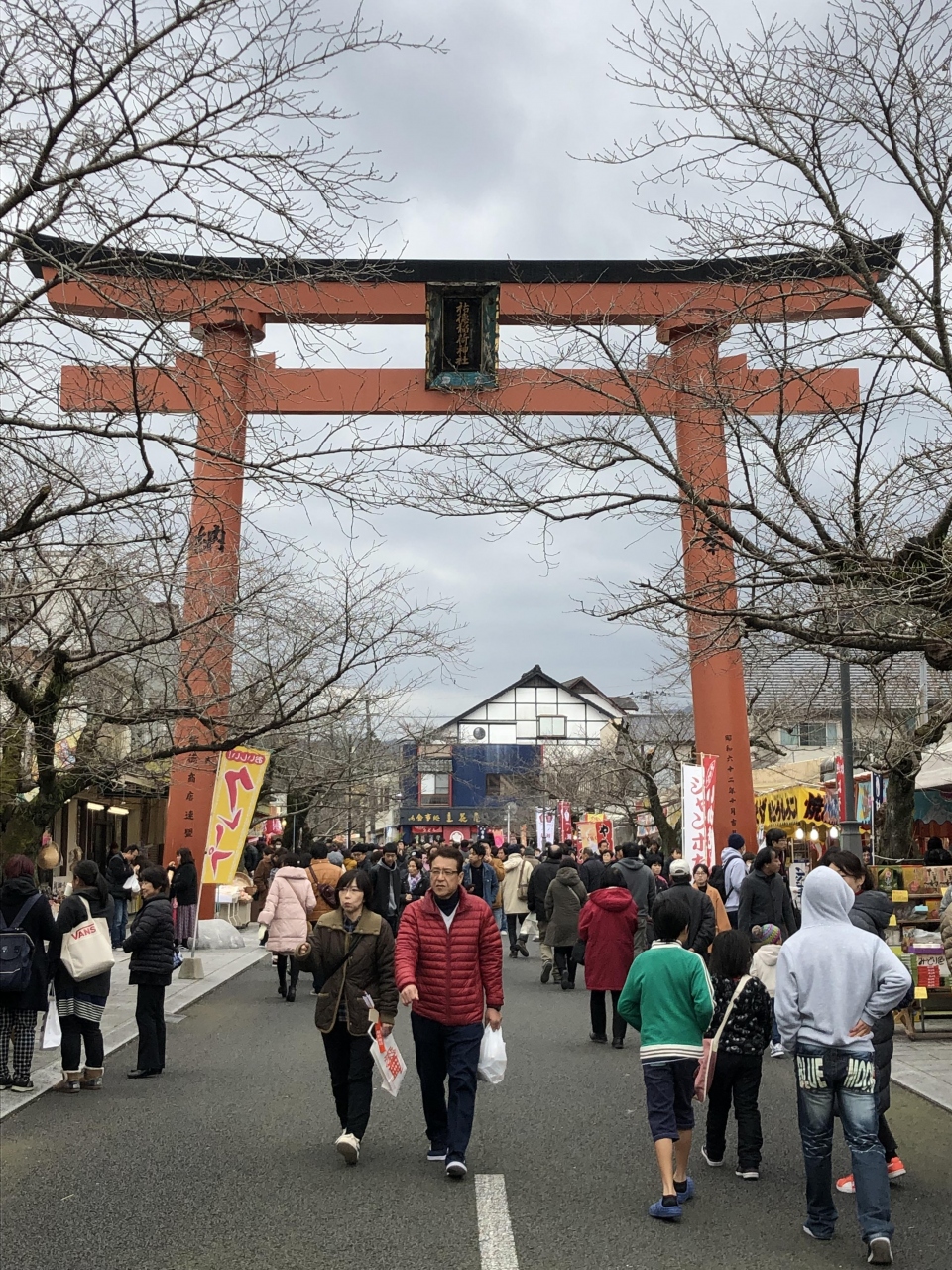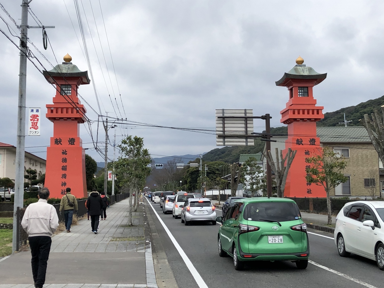 「初詣渋滞」には慣れているので、早々に途中下車。残り2キロ弱を歩いて目的地まで向かいます。参道も思った以上に参拝客が多く、「人間渋滞」を味わうことに。