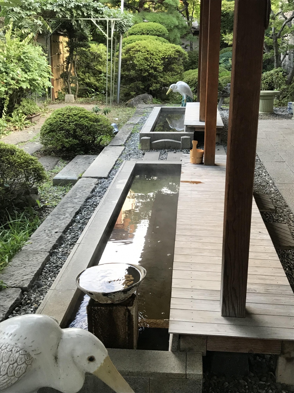 露天は旧館のかつての玄関を出て、翌朝7時から。他の客がおらず、ちゃっかりと写真撮影も。- 旅行時期