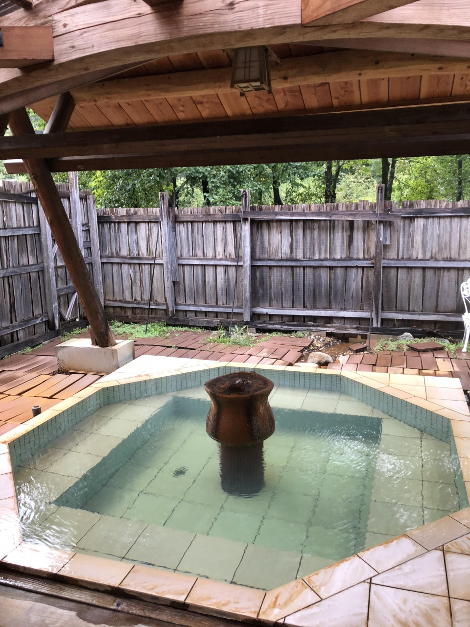 源泉掛け流しで、内湯は、熱い湯、緩い湯、その中間の3つの湯船。その他に半身浴、寝湯もあり。露天風呂は、内湯と同様に、3つの温度差のある湯船と立ち湯があり。