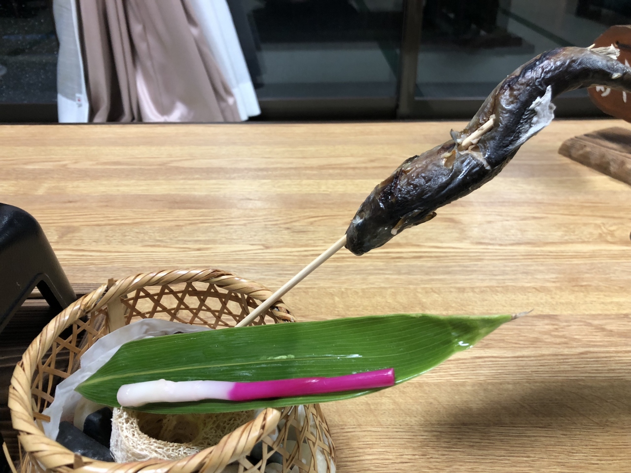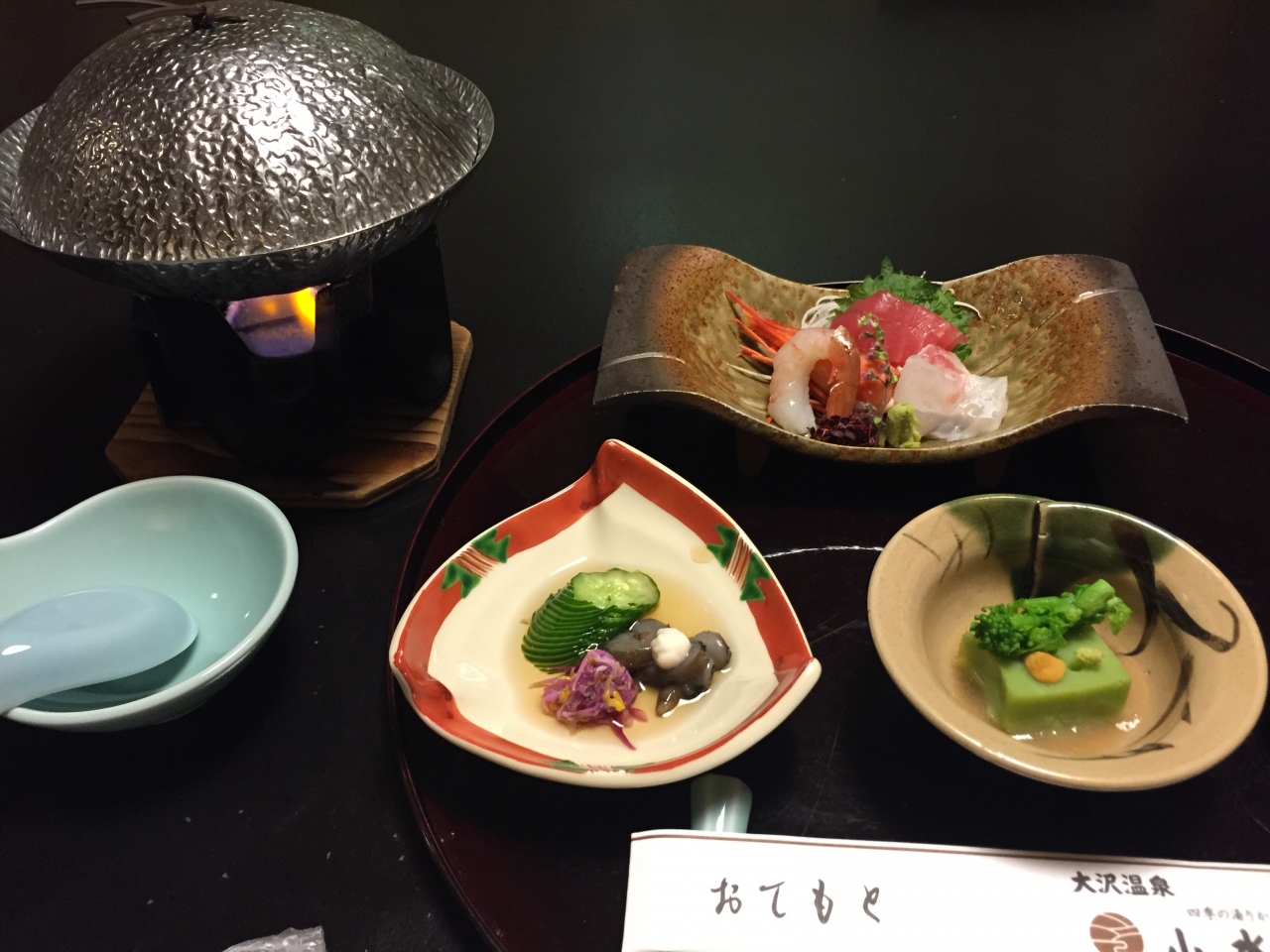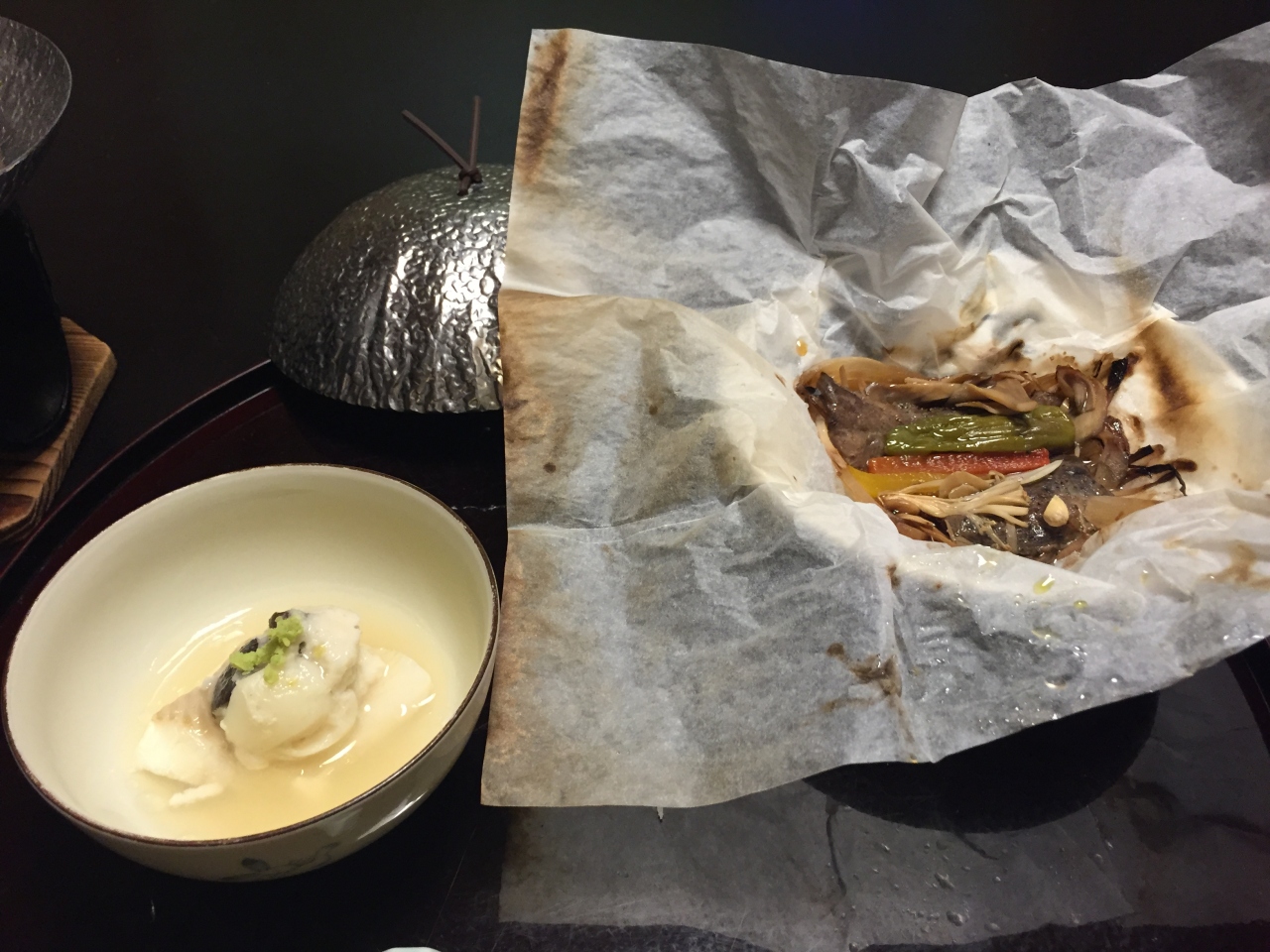 18時半から西館のレストランで夕食。懐石料理だが、ドライアイスのお造りや、木に串刺しされた岩魚姿焼きなど、演出にも凝っていて楽しい。