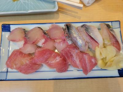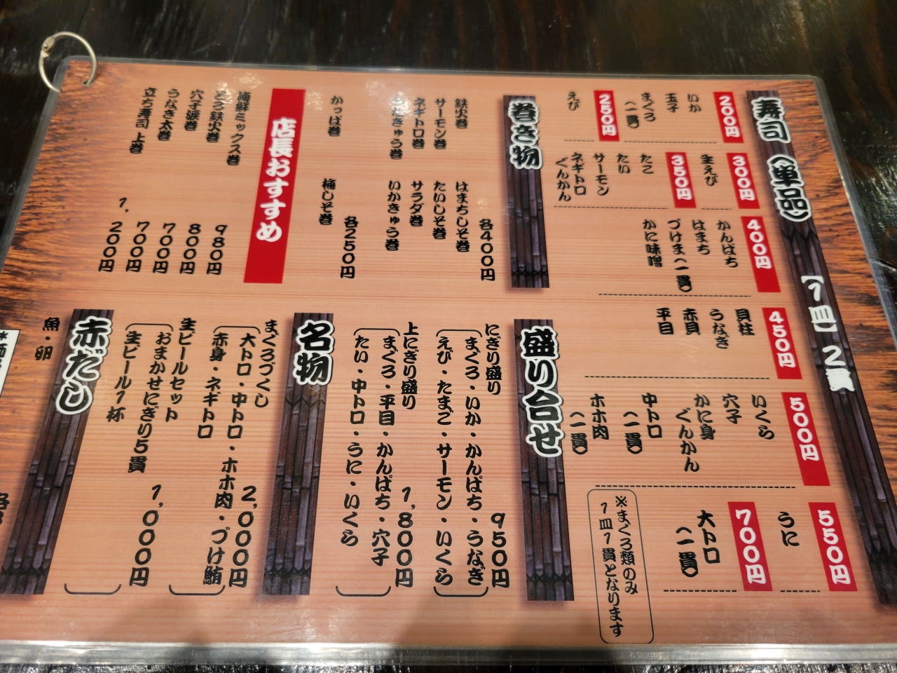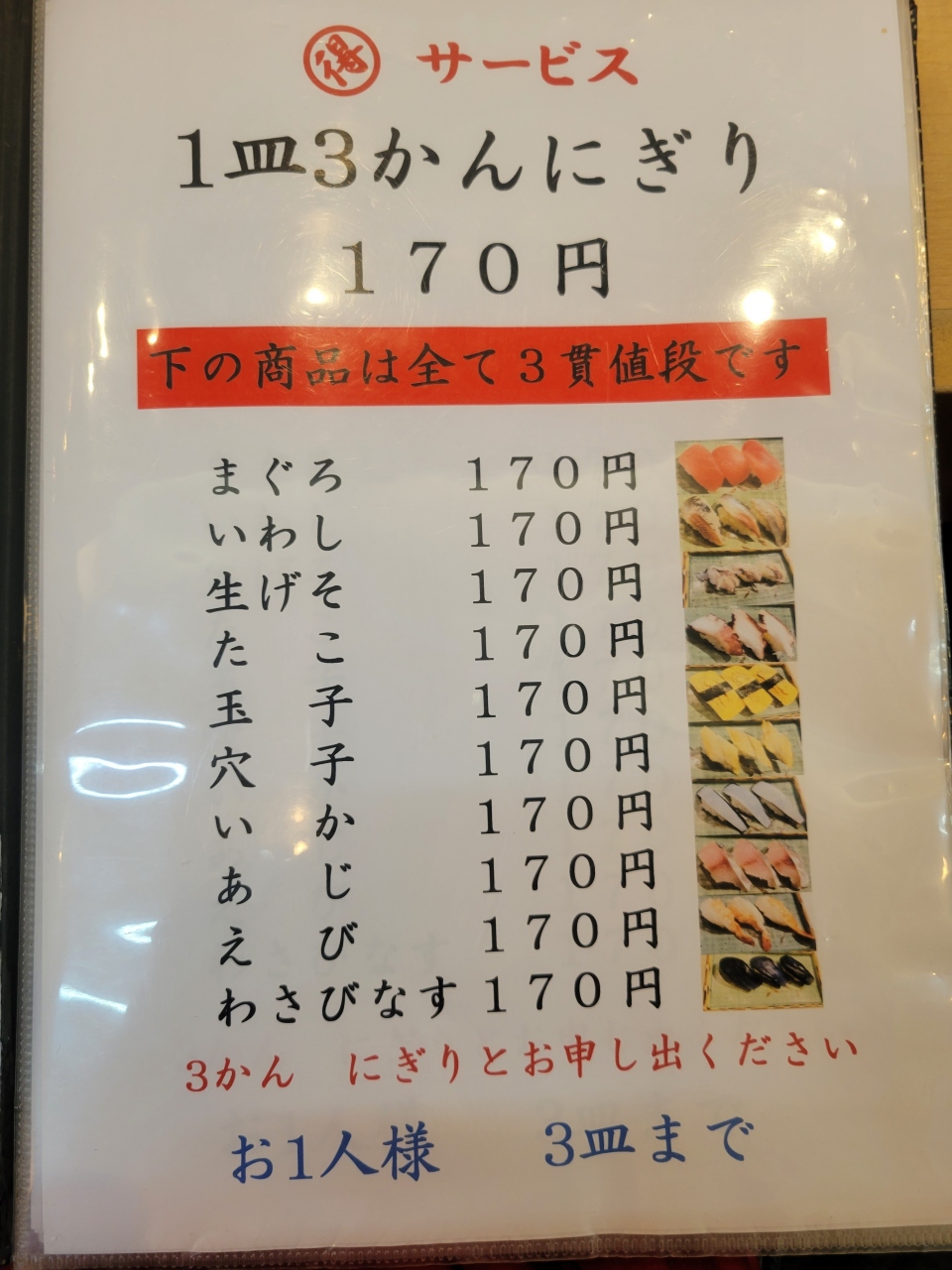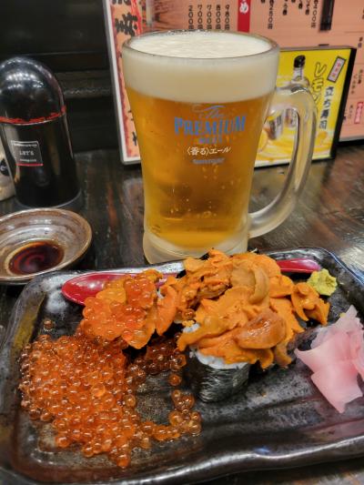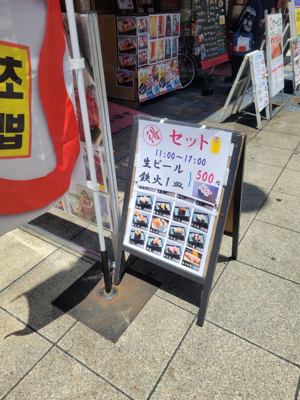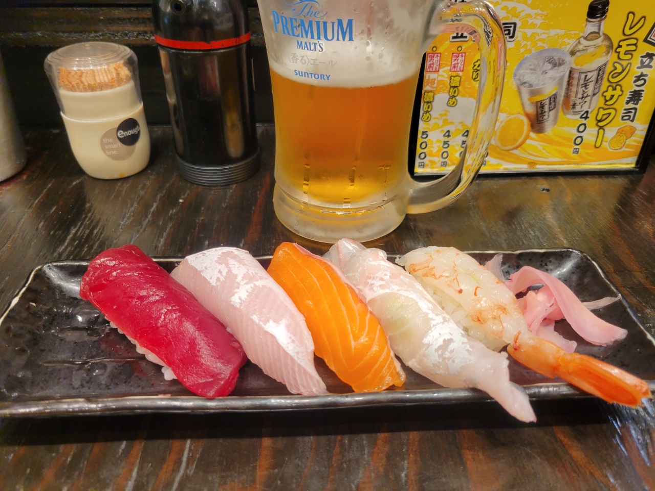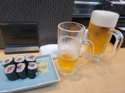 生ビールと鉄火巻で500円。その他、3貫で170円のお寿司もありました。