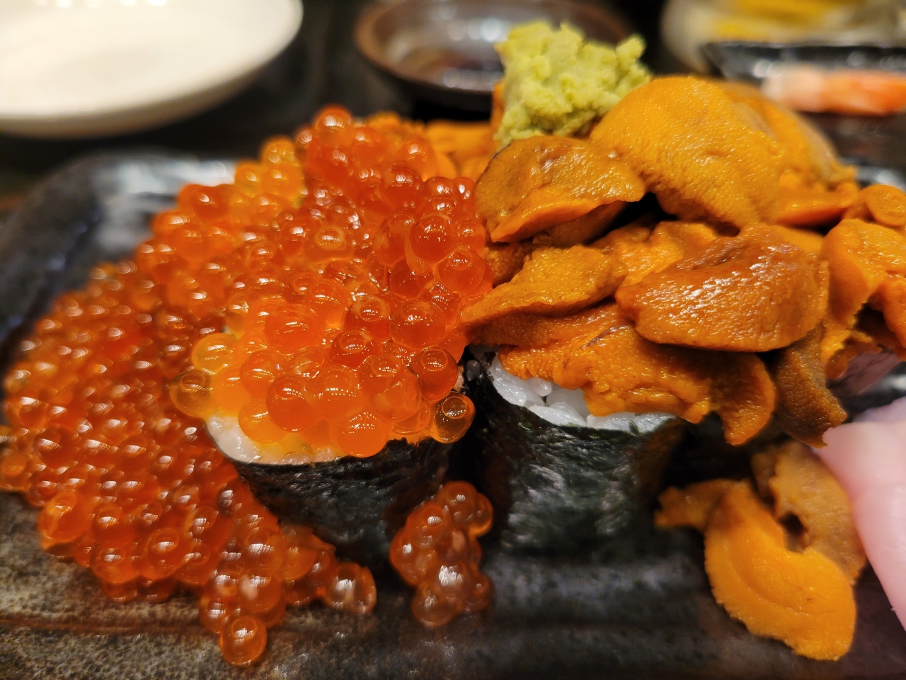 これだけでも十分なのですが、名物のうに・いくらのこぼれ盛も注文。かっぱ巻きの上に、これでもかと言うくらいの、ウニとイクラが乗ってました。