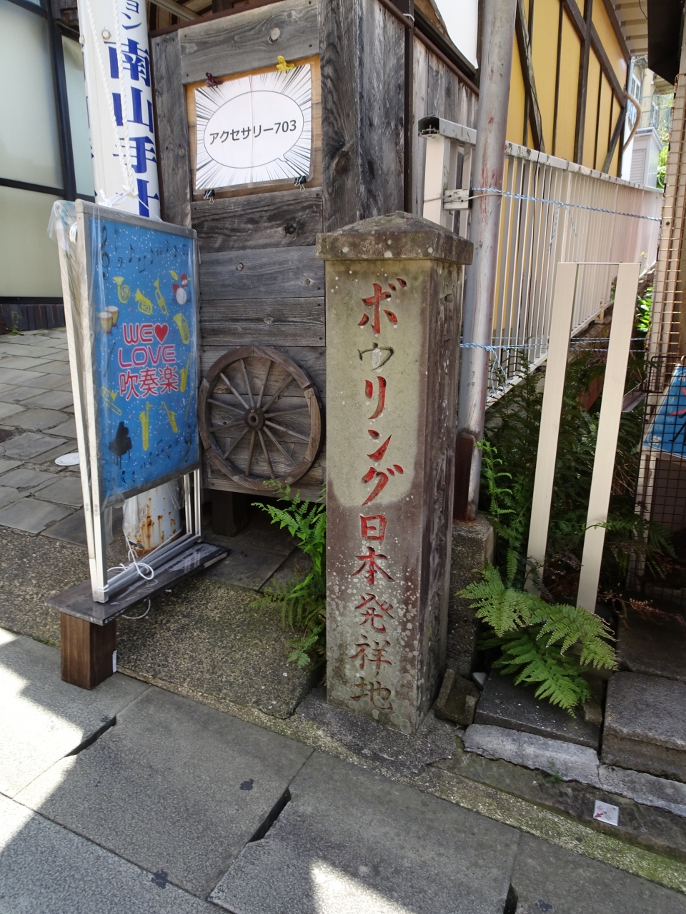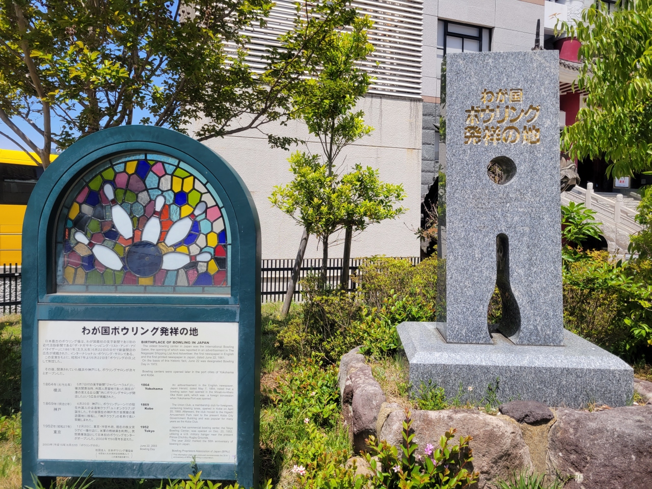 軍艦島デジタルミュージアムから、大浦天主堂方面に向かう坂の途中、コルベ神父にまつわる博物館の入口手前に「ボウリング日本発祥地の碑」がひっそりと立っています。これは、事前にYouTubeで確認していたので、見落としませんでしたが、うっかりすると見落としてしまうような感じでした。