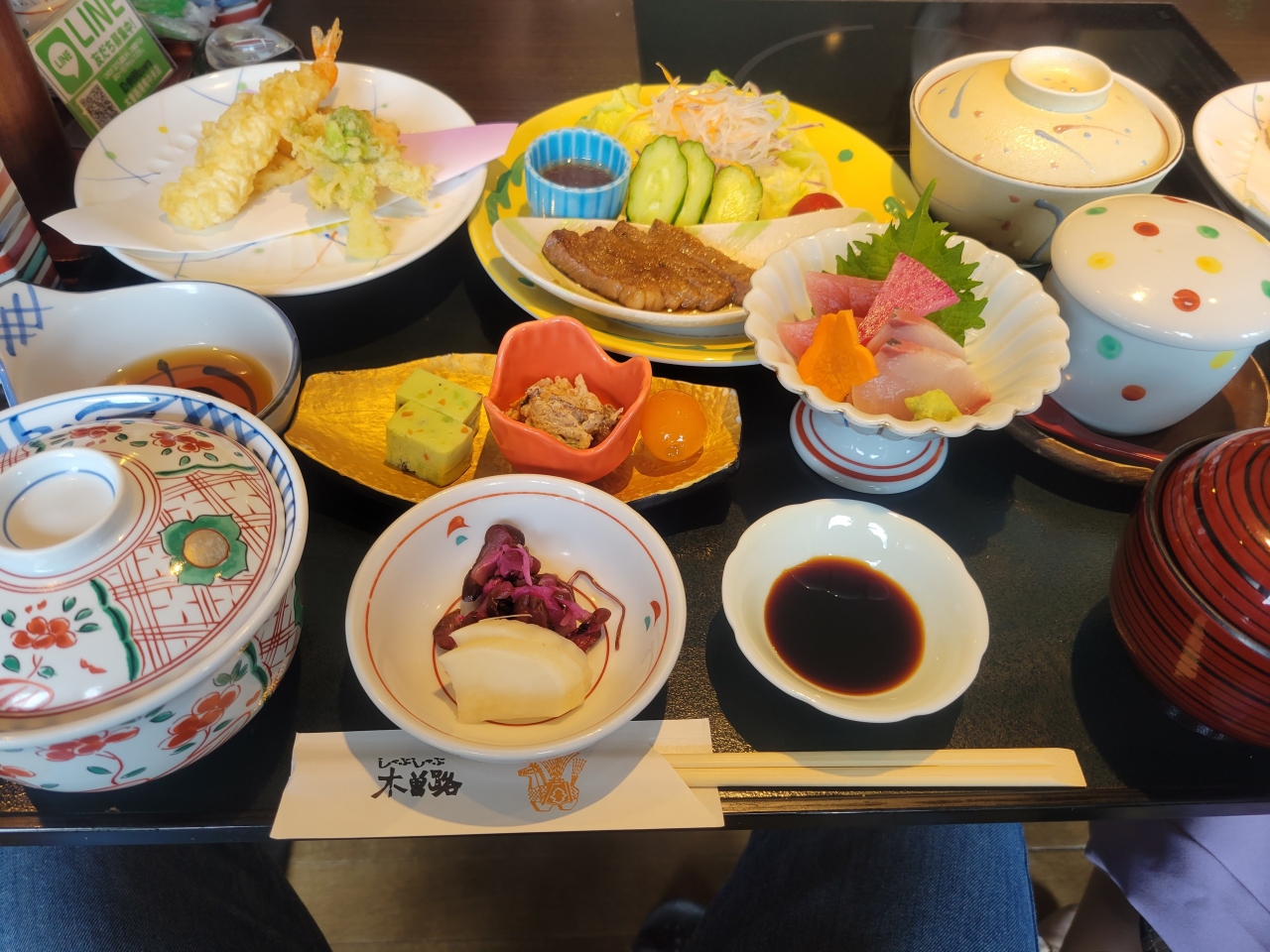 私たちは3300円のセットメニューを注文。大きなお盆には、先付け、煮物、刺身、天婦羅、ステーキ、茶碗蒸しなどが所狭しと載っていました。