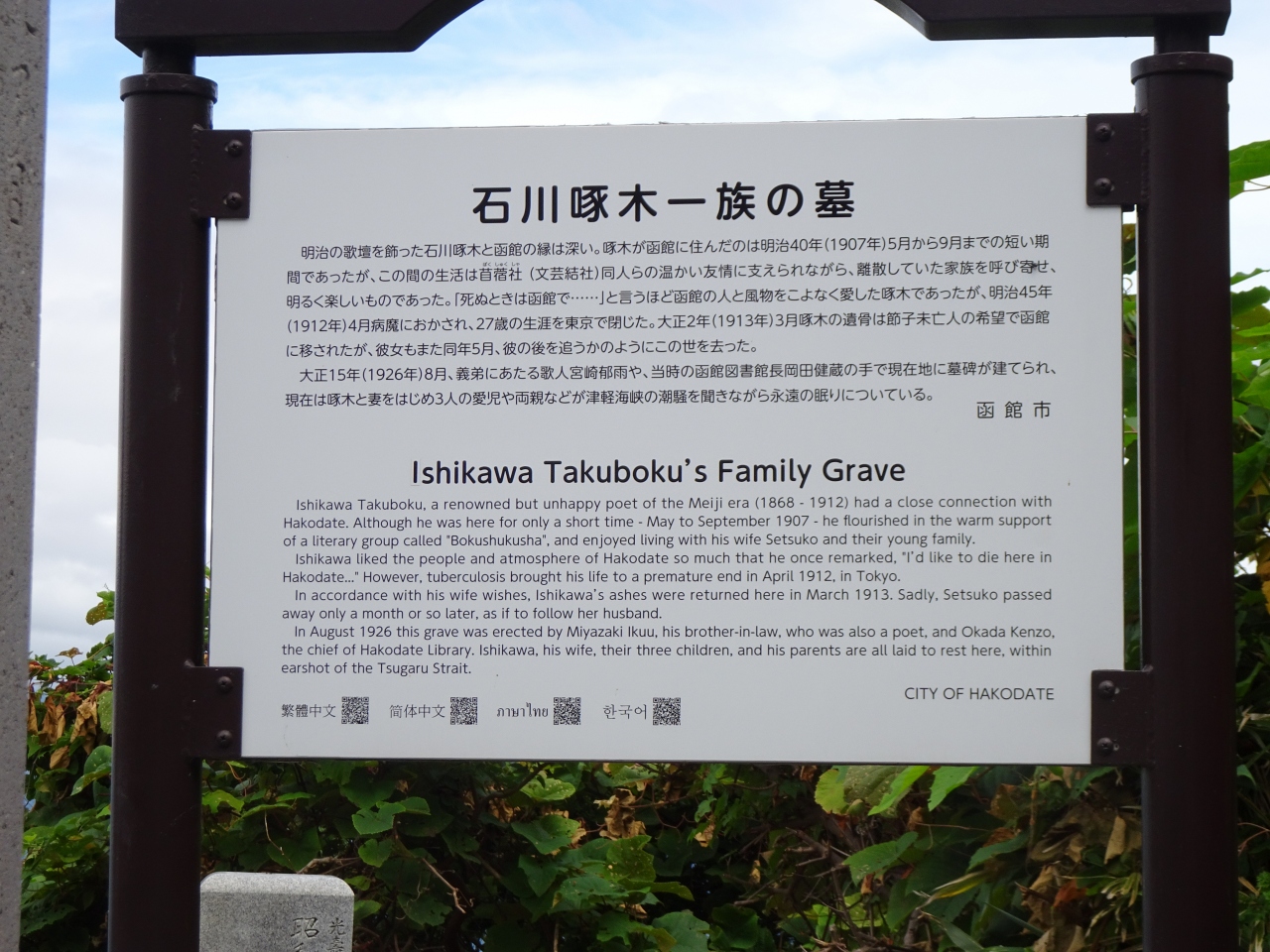 啄木一族のお墓を通り、立待岬に行くと、そのちょっと手前、向かって左下の方にあります。