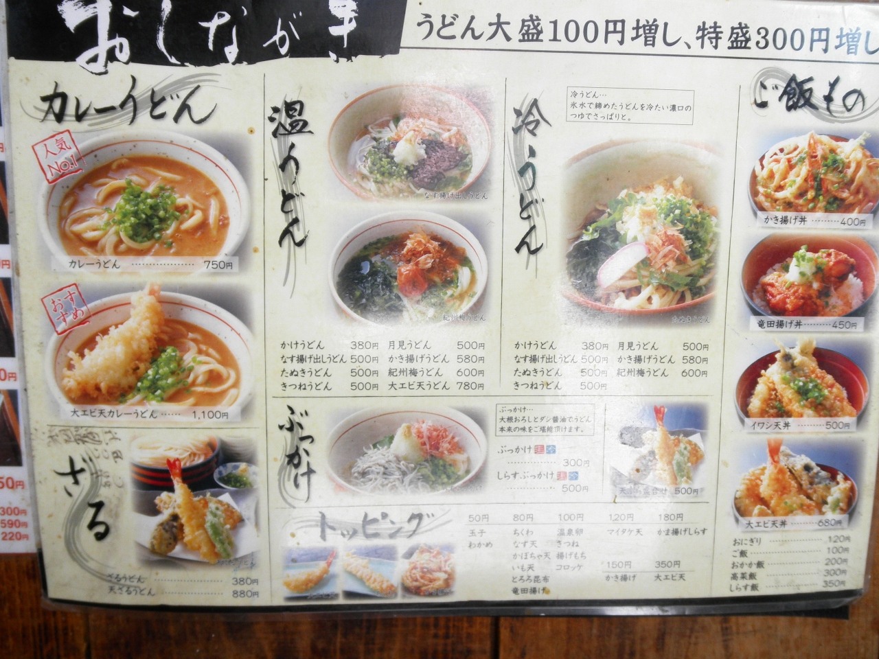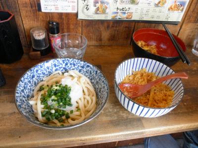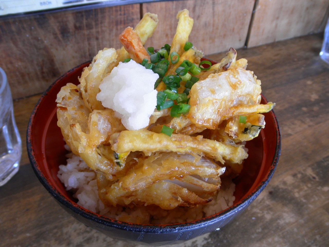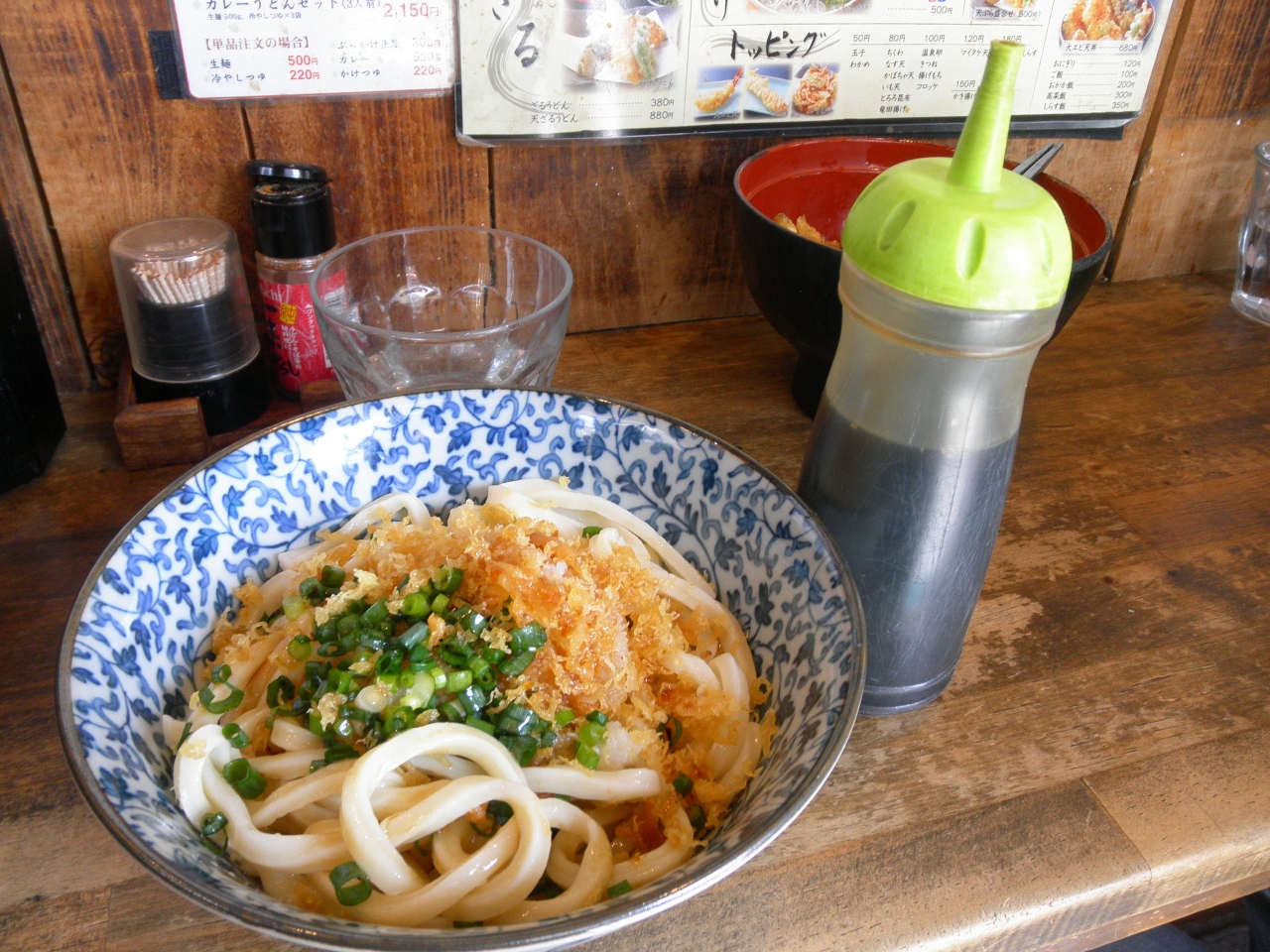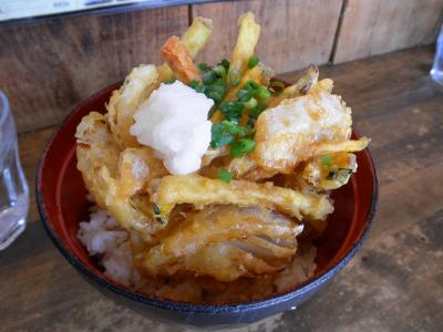 昼時を過ぎた店内はガラガラ。かき揚げ天丼(400円)は、格安だと思います。その他、ぶっかけうどんも食べましたが、大変腰の強いうどんで、サービスに天かすも出してくれました。