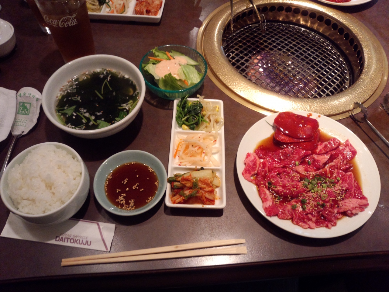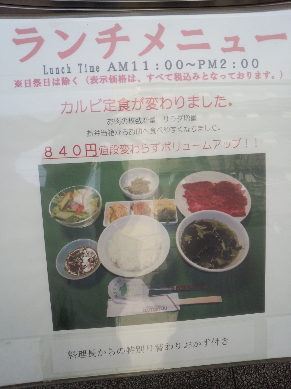 840円で焼肉のカルビ、スープ、ナムルにサラダも付いているので、大変お得だと思います。