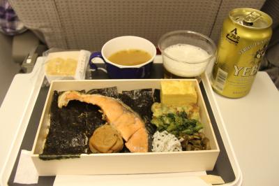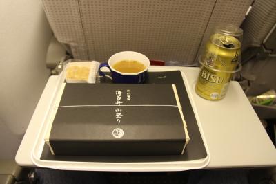 直行便は、深夜に羽田を出ますので、普通の機内食ではありません。海苔弁でした。この海苔弁、大変美味しく驚くほどでした。