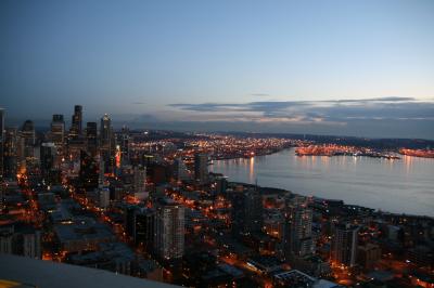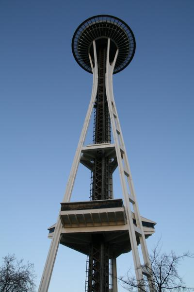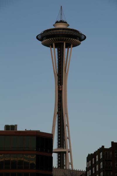 日没前には登りたかったのが、10分以上待たされてからの入場。16:00頃、時速16kmの速度のエレベーターで一気に展望台へ。展望台まで43秒ほどである。1962年に開催された世界博覧会の跡地につくられた総合公園であるシアトルセンター内にある。高さ184m(610フィート)、幅のもっとも広いところは42m(138フィート)、総重量9,550トン。地上から159m離れた展望台に設置されている。是非、日没前に登って、幻想的な夕焼けをご覧下さい。