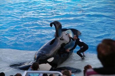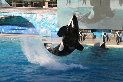 シャチのショーは迫力充分で、スタジアムの広さも桁違いですが、満員でした。