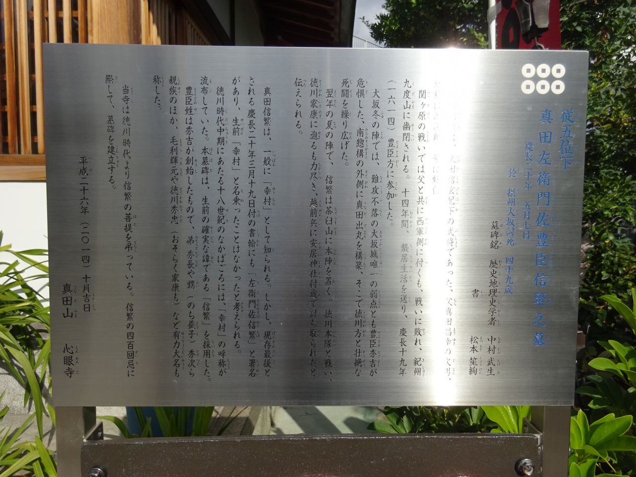 NHKの大河ドラマで真田丸を放映していて、幸村の歴史に興味を持ち、ゆかりの地を訪ねてきました。真田氏は大阪にもゆかりの地が多いようで、地下鉄玉造駅から徒歩圏内に多く存在しています。その中の1つですが、真田幸村の墓や各所に六文銭が見られました。