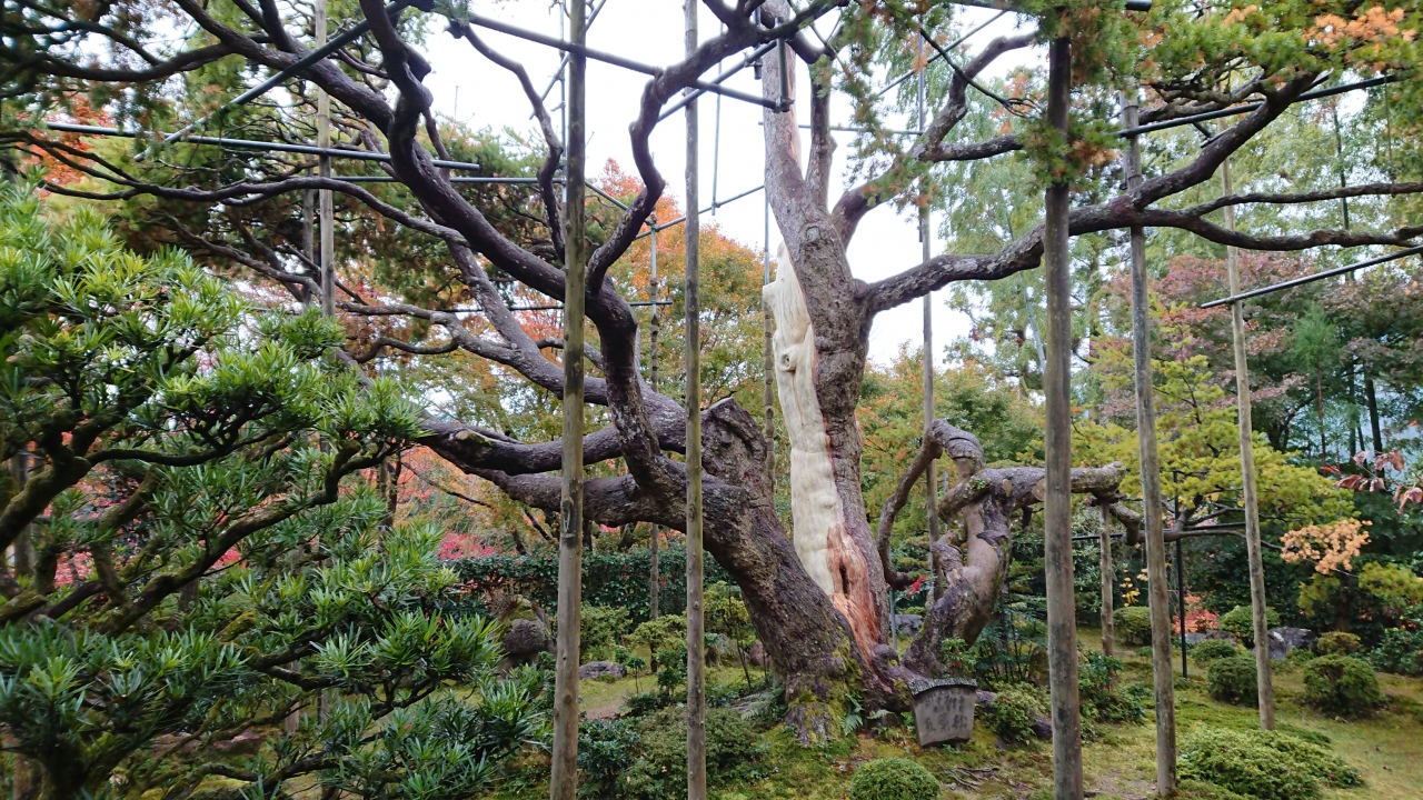 大原にある宝泉院は、勝林院の子院として平安時代末期に建立されたようです。勝林院にはかつて四つの子院がありましたが、現在でも残っているのは実光院と宝泉院の二つだけのようです。宝泉院にある庭の一つ盤桓園は、客殿の西側に位置しています。この庭にあるのが、京都市の天然記念物に指定されている樹齢700年を超える五葉松です。既にかなりの年月を生きているため、木自身が傷んでしまっているようで、白い樹脂のようなもので大半が覆われていて、ちょっと痛々しい感じもしました。こちらのお庭を眺めながら、お茶を頂くことになりますが、かなり混んでいて、雰囲気を味わうにはちょっと残念な感じでもありました。