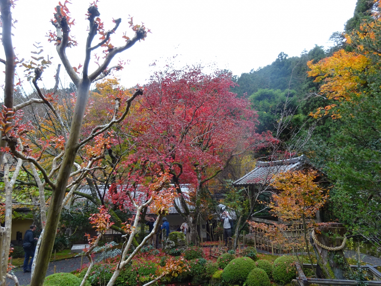 京都の中心地から、車で10~20分ほどでしょうか? 山の方に進むと、有名な観光地、大原に着きます。路線バスも出ていますが、帰りのバス停は長蛇の列でしたので、乗り切れないと思いました。少し標高も高いので、紅葉の進み具合や、気温・天気も中心地とは違っていました。お寺の数々の他、お土産屋さんが軒を連ねている場所もありました。アジアからの観光客も多かったです。お茶とお菓子が頂けるお寺もあります。