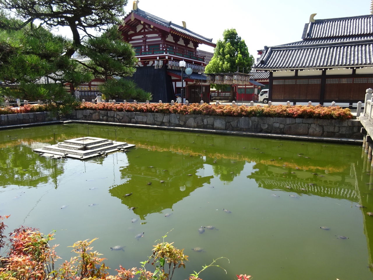 和宗総本山で、今から約1400年以上前に聖徳太子が建立した、日本仏法最初の官寺である四天王寺。外来種のアカミミガメが沢山いる、四天王寺の北側にある池です。水中、陸上を問わず、無数の亀たちがいましたが、日本のイシガメやクサガメの姿は見当たりませんでした。