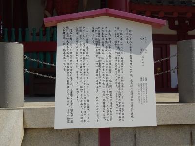 四天王寺中心伽藍は焼失を繰り返し、天災等の影響も受けてきた歴史がある。現在の中門は、昭和38年落慶で、創建当初の様式を再現したもの。中門は中心伽藍の南端にあって、伽藍の守護神である金剛力士(仁王)を安置することから仁王門とも呼ばれている。
