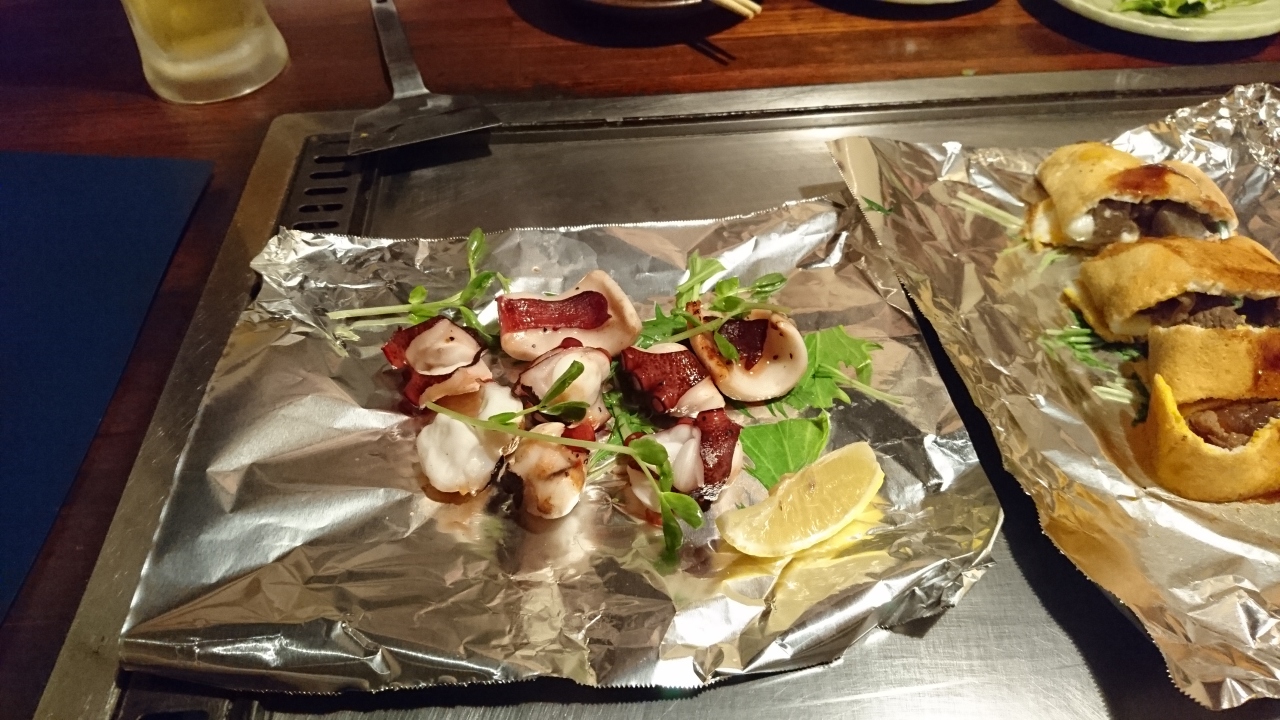 鉄板焼きのお店らしく、テーブル中央には鉄板が組み込まれていました。