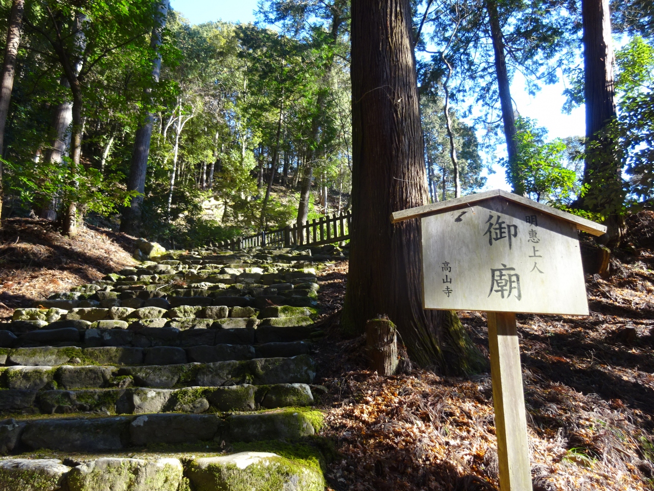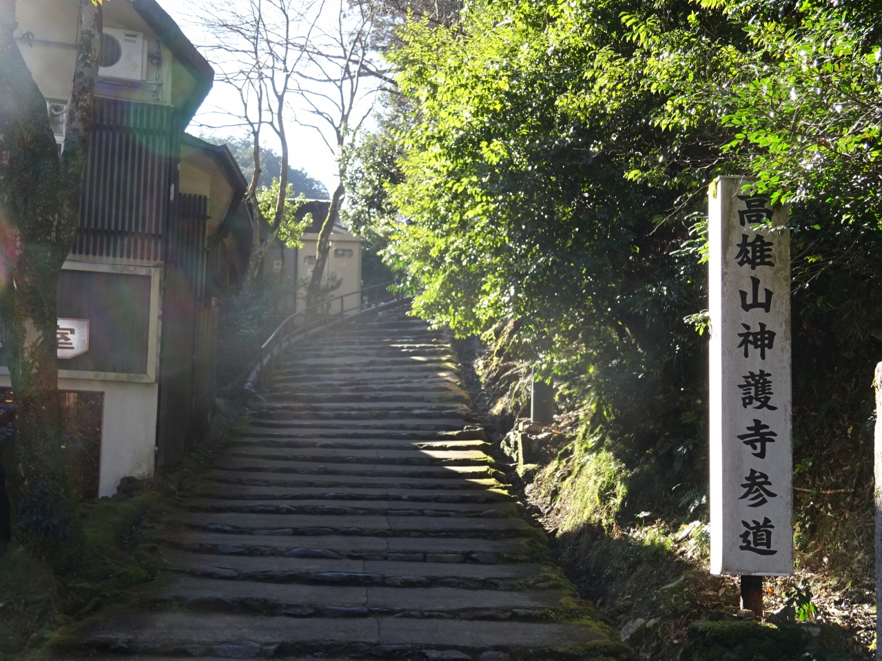高山寺から歩いて向かいました。しかし、想像以上にきつい階段が待っていました。段数を数えたわけではありませんが、300~400段は有ったかと思います。