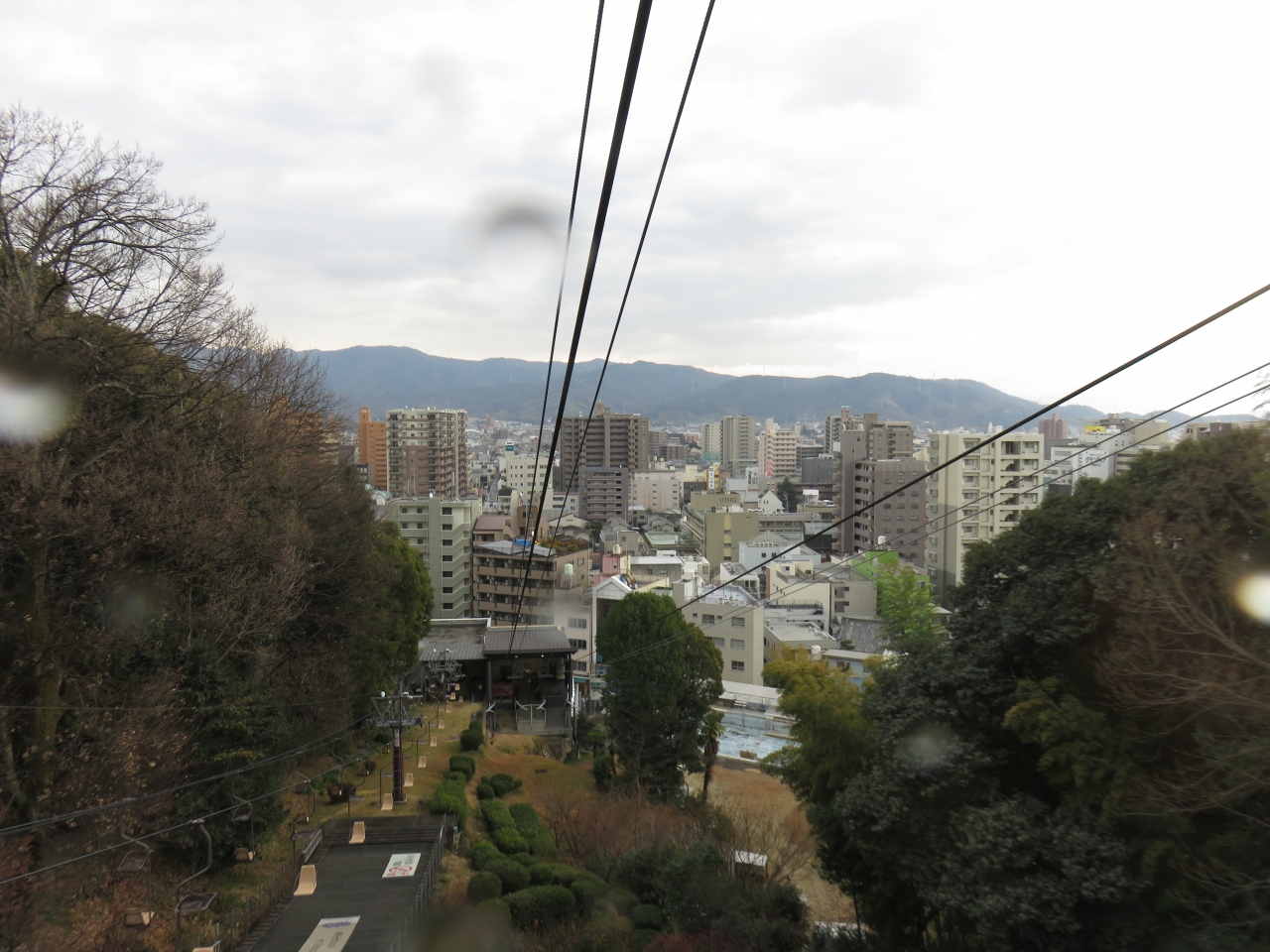 松山城への乗り物です。リフトとロープウェイの共通券で、どちらでも選択することができますが、雨等だとリフトには乗車できません。ロープウェイは10分毎の運転で、運転されています。歩いても登れる距離ですが、あいにくの天気だったので、これしか選択の余地がありませんでした。およそ3分で終点に着いてしまいます。