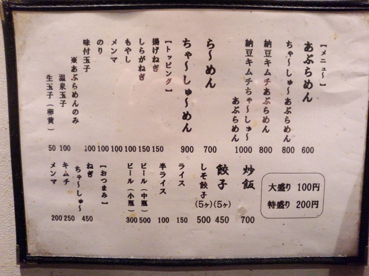 看板メニューは、ラーメンと「あぶらめん」みたいだったので、とりあえず「あぶらめん」を注文。