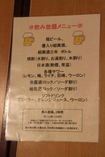 ちょっと狭い所に押し込まれた感が頂けませんが、飲み放題つきのコースが4000円未満で頂けるので、大酒のみには有難いです。