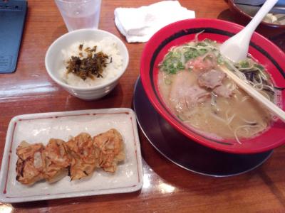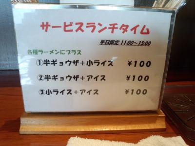 ランチタイムに伺いましたが、ランチセットがあるので+100円で、半ライスと、半餃子が付きました。博多ラーメンらしく、辛子高菜がテーブルに置いてあるので、ご飯に載せて頂きました。
