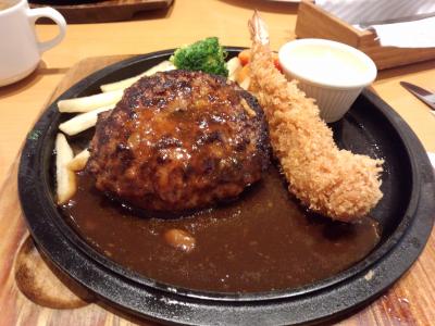 ハンバーグとエビフライのセットに、ライスが付いています。