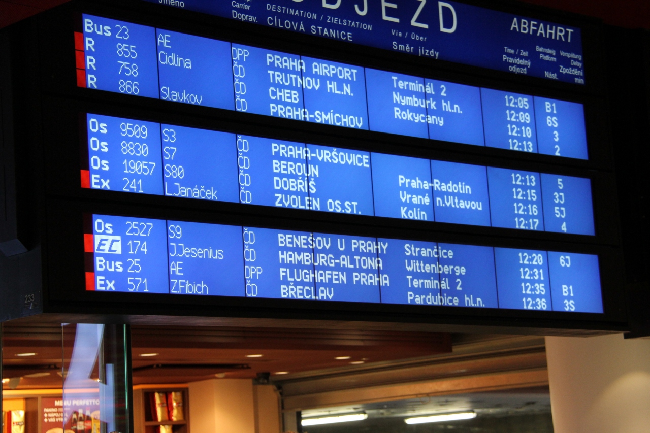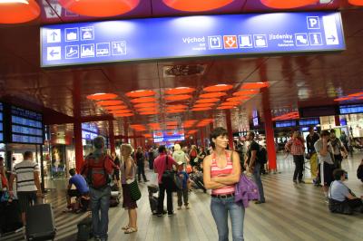 ヨーロッパは鉄道での移動が便利ですよね。私たちもユーレイルパスを用いて、鉄道を利用して回りました。チェコはユーロが使えないので、換金する両替所を利用しなければなりません。ここの駅には、その両替所の他、飲食店やハム・ソーセージの店、土産屋など色々なお店があって、列車の到着まで充分時間が潰れます。勿論、列車案内もキチンとされていました。