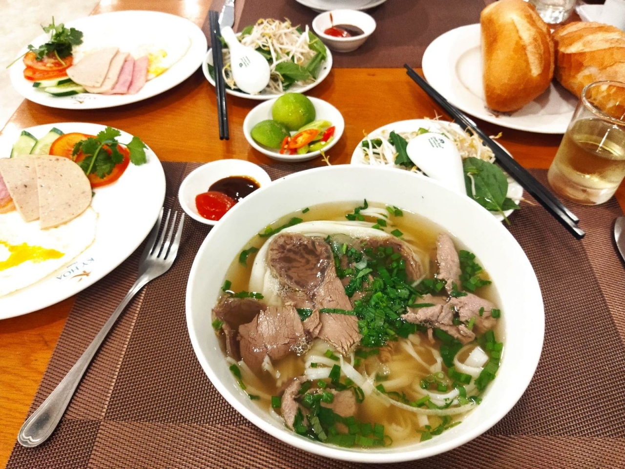 朝食は、ロビー階の宴会場が会場になります。麺料理と卵料理はカウンターで作ってもらえます。それ以外のおかず、サラダ、果物などはビュッフェ形式です。ここの朝食は、比較的シンプルであまり凝ったものはありませんでしたが、とても気に入りました。タコさんウインナーがカウンターの大皿いっぱいに盛ってあったり、それをベトナムの子が皿にたくさん取ってたりするのを見ると、心の中で微笑んでしまいました、カフェスダー、シチュー、蒸し芋、ゆで野菜、キャッサバのココナツミルク煮など、毎日たくさんいただきました。メニューは毎日少し変化があります。果物はスイカとグアバが多かったです。唯一の問題点は、朝食の提供が8時半までだということです。- 旅行時期