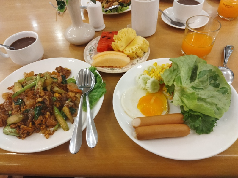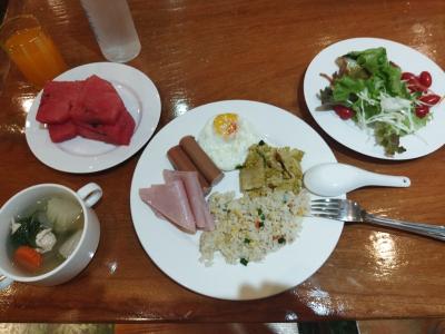 朝食は、チェックイン時に受け取った朝食券を渡します。朝食はおいしかったです。メインのおかずは変化しますが、それ以外は毎日だいたい同じものが並びます。フルーツはスイカのみ。コーヒーはインスタントです。- 旅行時期