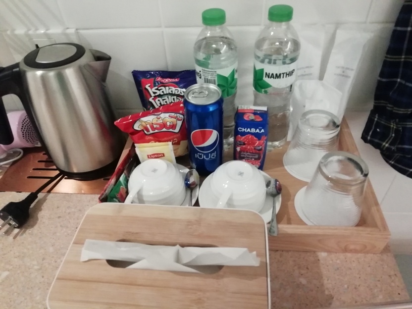 歯ブラシや櫛、スリッパ、電気ポットとティーバッグのお茶、ペットボトルのミネラルウォーターまでありました。WiFi無料で遅いですが繋がりました。ACプラグは日本と同型です。浴室はシャワーのみですが、湯温も水圧も問題なかったです。