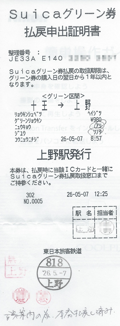 終点の上野駅の公園口改札にメモを見せ、差額の払い戻しを求めた。