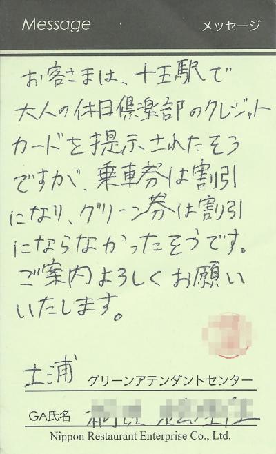 やむなく普通料金で乗車し、この旨をグリーンアテンダントの女性に申し出た。アテンダントは車掌に相談したが、車内で証明の発行や払い戻しはできないが、経緯を書くので苦情の窓口である駅の改札に見せて話をしてくれとのことで、写真に示すメモを書いてくれた。