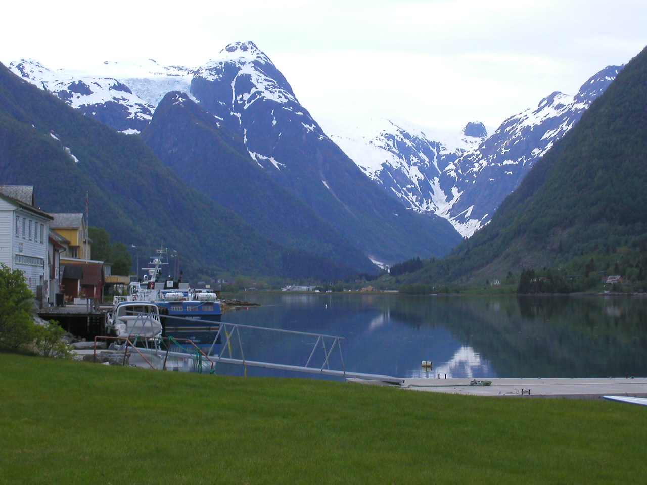 このホテルは世界最大規模のノルウエー・ソグネフィヨルドの枝フィヨルドである美しいFjearlansfjordの最奥部Mundalの集落にあります。ホテルの前は直ぐにフィヨルド、背後にはヨスタデルブリーン氷河国立公園の雪を被った山々が迫っています。