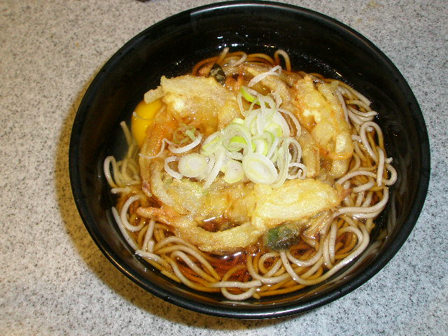 店の入り口の券売機で食券を購入、直ぐに用意して頂けました。関西では少ないかき揚げそばを生卵入りで注文。