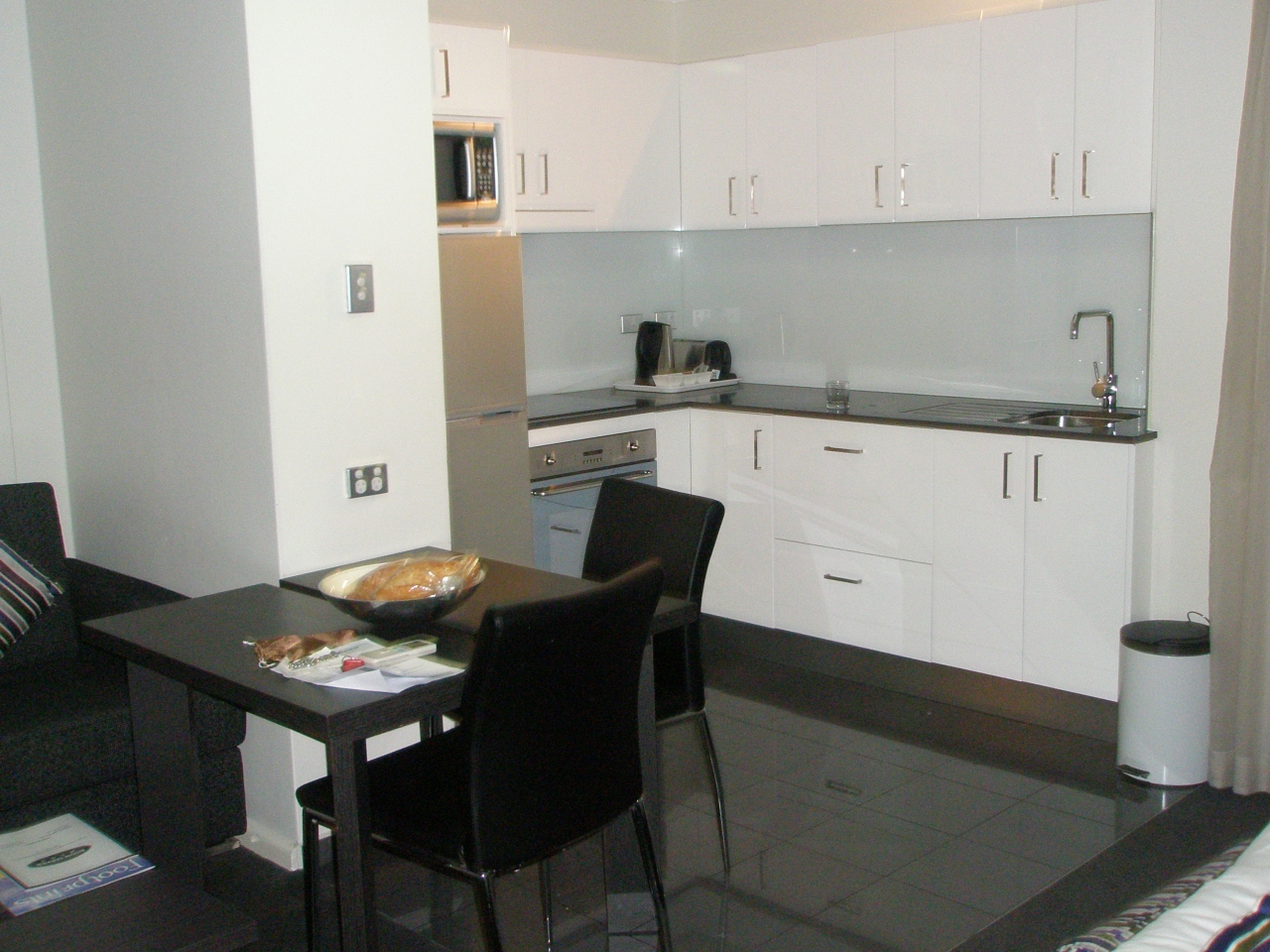 キングサイズベットルームに宿泊。 部屋内は十分に広く、キッチン付で大型冷蔵庫、オーブン、電子レンジ、トースター、ポット、食器類完備。 近くにスーパーもあるので、そこで食材を調達すれば簡単な調理もできて、物価の高いシドニーでの長期滞在に重宝しました。