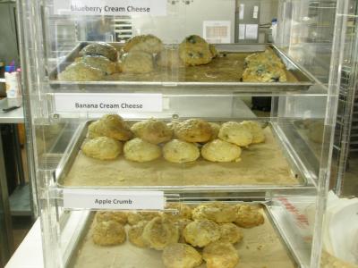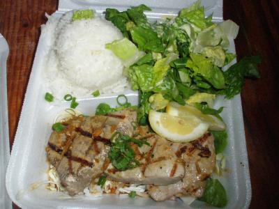 PM8時頃夕食用に「ロコモコ」と「わさび醤油アヒステーキ」のプレートランチを購入。店の前のテーブルで4人でシェアして頂きました。スコーンが有名のようですが、さすがにこの時間では売り切れていて断念。 翌朝9時頃にいくと、たくさんのスコーンも並んでいました。