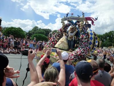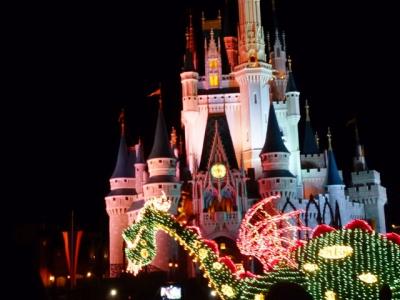 人気の夜のパレードです。夜遅くまでやっているマジックキングダムでは、日本とは違って夜に何回かやるので、お客さんが分散されて、あまり混みません。開始してからでも、探せばしっかり見れる場所がありました。この音楽を聞くとディズニーだな、と感じられるので、外せません。